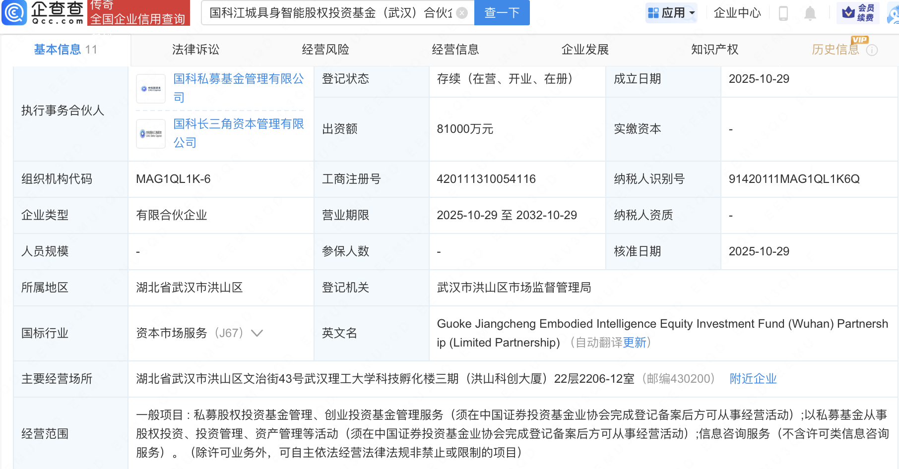 企查查APP显示,近日,国科江城具身智能股权投资基金(武汉)合伙企业(有限合伙)成立,出资额8.1亿元,经营范围包含:私募股权投资基金管理、创业投资基金管理服务等。企查查股权穿透显示,该企业由中科联动创新股权投资基金(绍兴)合伙企业(有限合伙)、国科长三角资本管理有限公司等共同出资。