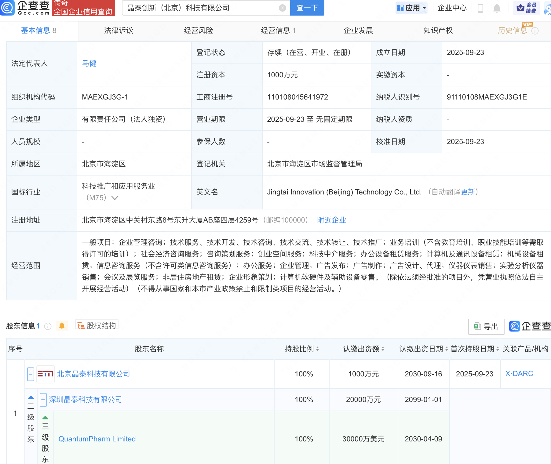 企查查APP显示,近日,晶泰创新(北京)科技有限公司成立,注册资本1000万元,经营范围包含:创业空间服务;科技中介服务;办公设备租赁服务;计算机及通讯设备租赁等。企查查股权穿透显示,该公司由晶泰控股关联公司北京晶泰科技有限公司全资持股。