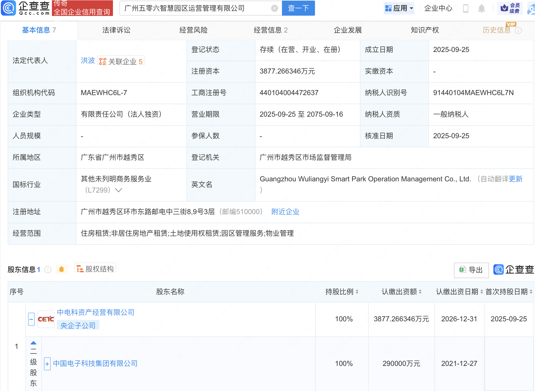 企查查APP显示,近日,广州五零六智慧园区运营管理有限公司成立,经营范围包含:住房租赁;非居住房地产租赁;土地使用权租赁;园区管理服务;物业管理。企查查股权穿透显示,该公司由中国电子科技集团有限公司间接全资持股。
