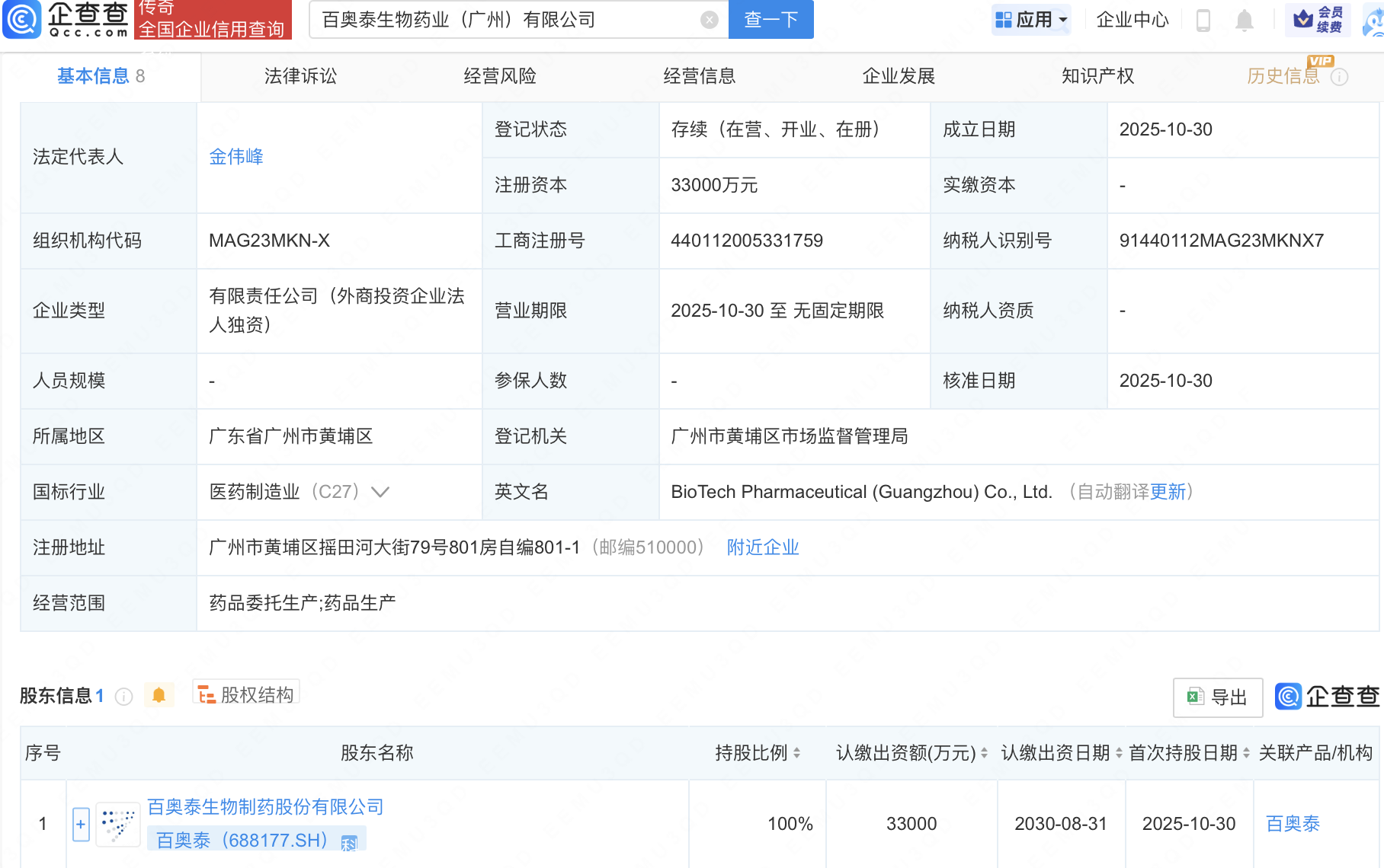 企查查APP显示,近日,百奥泰生物药业(广州)有限公司成立,注册资本3.3亿元,经营范围包含:药品委托生产;药品生产。企查查股权穿透显示,该公司由百奥泰(688177)全资持股。