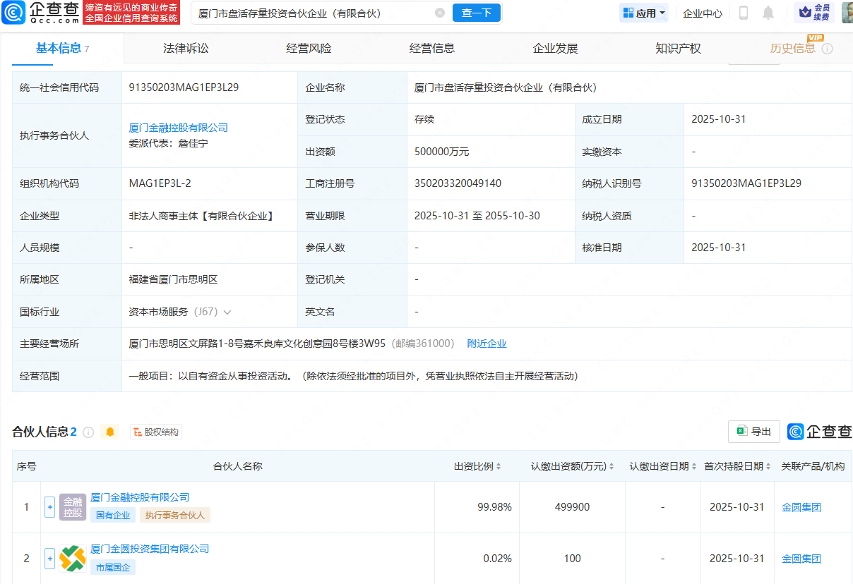 企查查APP显示,近日,厦门市盘活存量投资合伙企业(有限合伙)成立,出资额50亿元,经营范围包含:以自有资金从事投资活动。企查查股权穿透显示,该合伙企业由厦门金融控股有限公司、厦门金圆投资集团有限公司共同持股。