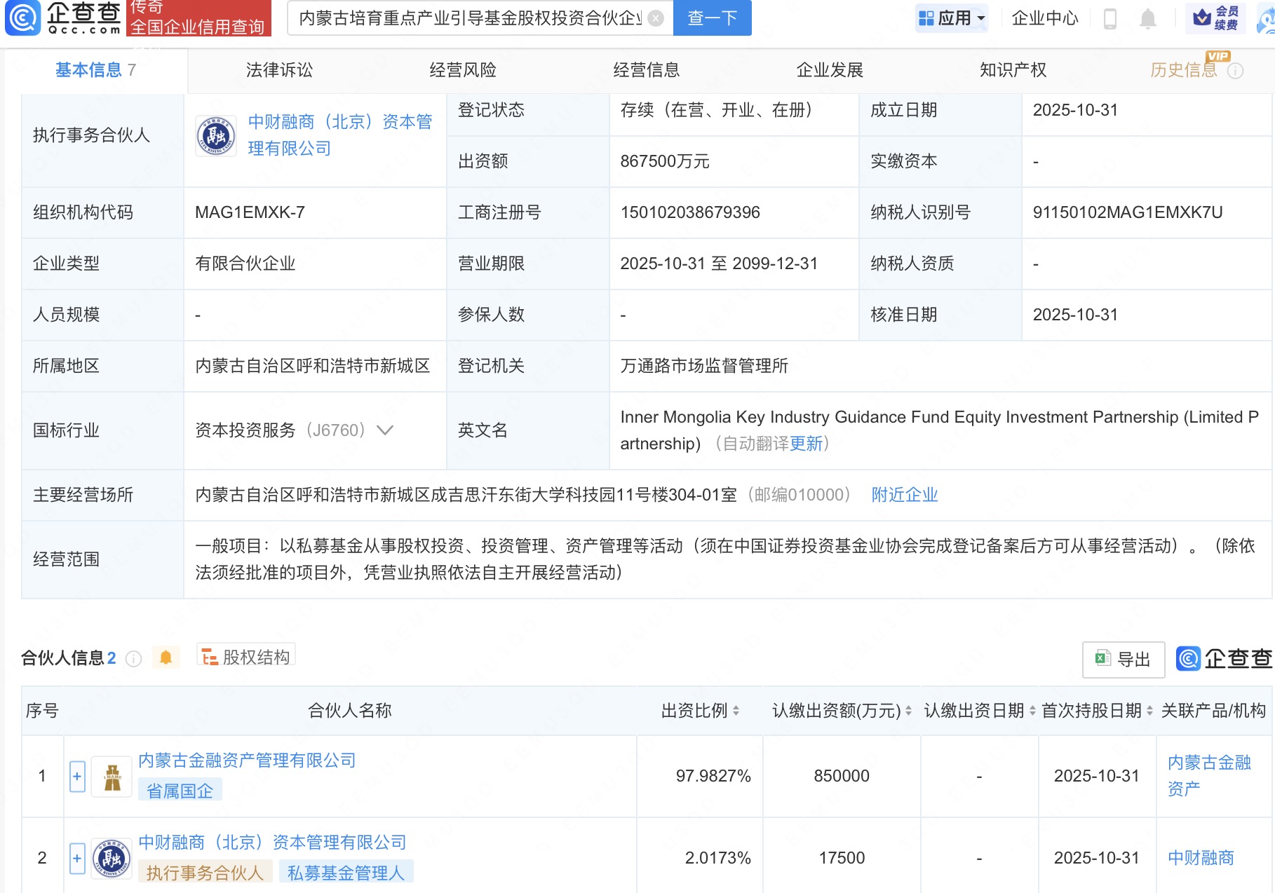 企查查APP显示,近日,内蒙古培育重点产业引导基金股权投资合伙企业(有限合伙)成立,出资额86.75亿人民币,经营范围包括以私募基金从事股权投资、投资管理、资产管理等活动。企查查股权穿透显示,该企业由内蒙古金融资产管理有限公司、中财融商(北京)资本管理有限公司共同出资。