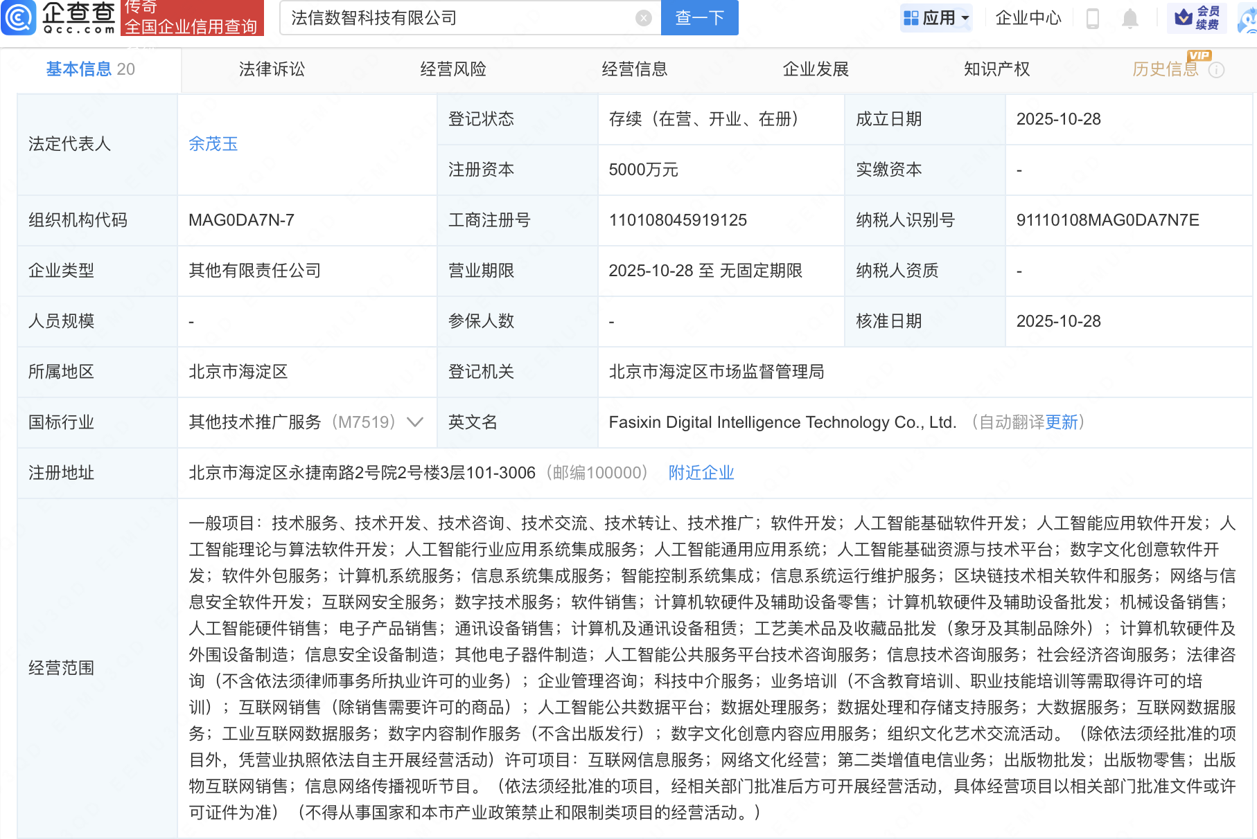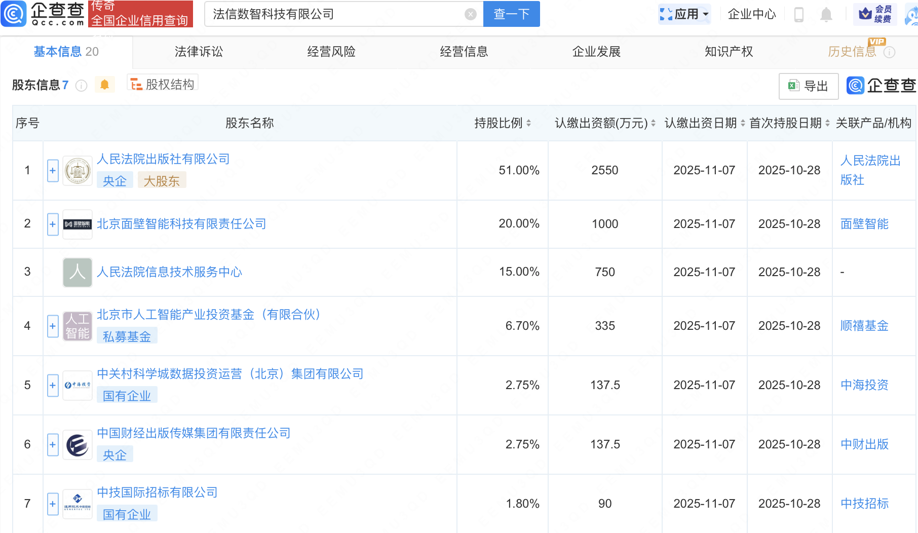企查查APP显示,近日,法信数智科技有限公司成立,注册资本5000万元,经营范围包含:人工智能行业应用系统集成服务;人工智能通用应用系统;人工智能基础资源与技术平台;数字文化创意软件开发等。企查查股权穿透显示,该公司由人民法院出版社有限公司、北京面壁智能科技有限责任公司、北京市人工智能产业投资基金(有限合伙)等共同持股。
