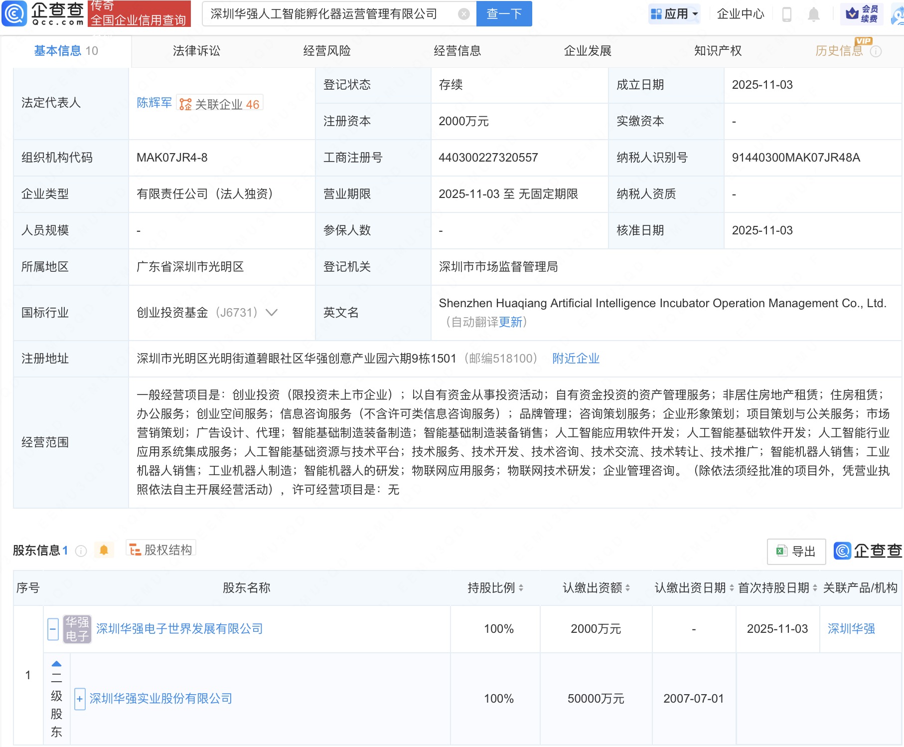 企查查APP显示,近日,深圳华强人工智能孵化器运营管理有限公司成立,法定代表人为陈辉军,注册资本2000万人民币,经营范围包括创业投资、以自有资金从事投资活动、自有资金投资的资产管理服务等。企查查股权穿透显示,该公司由深圳华强(000062)旗下深圳华强电子世界发展有限公司全资持股。