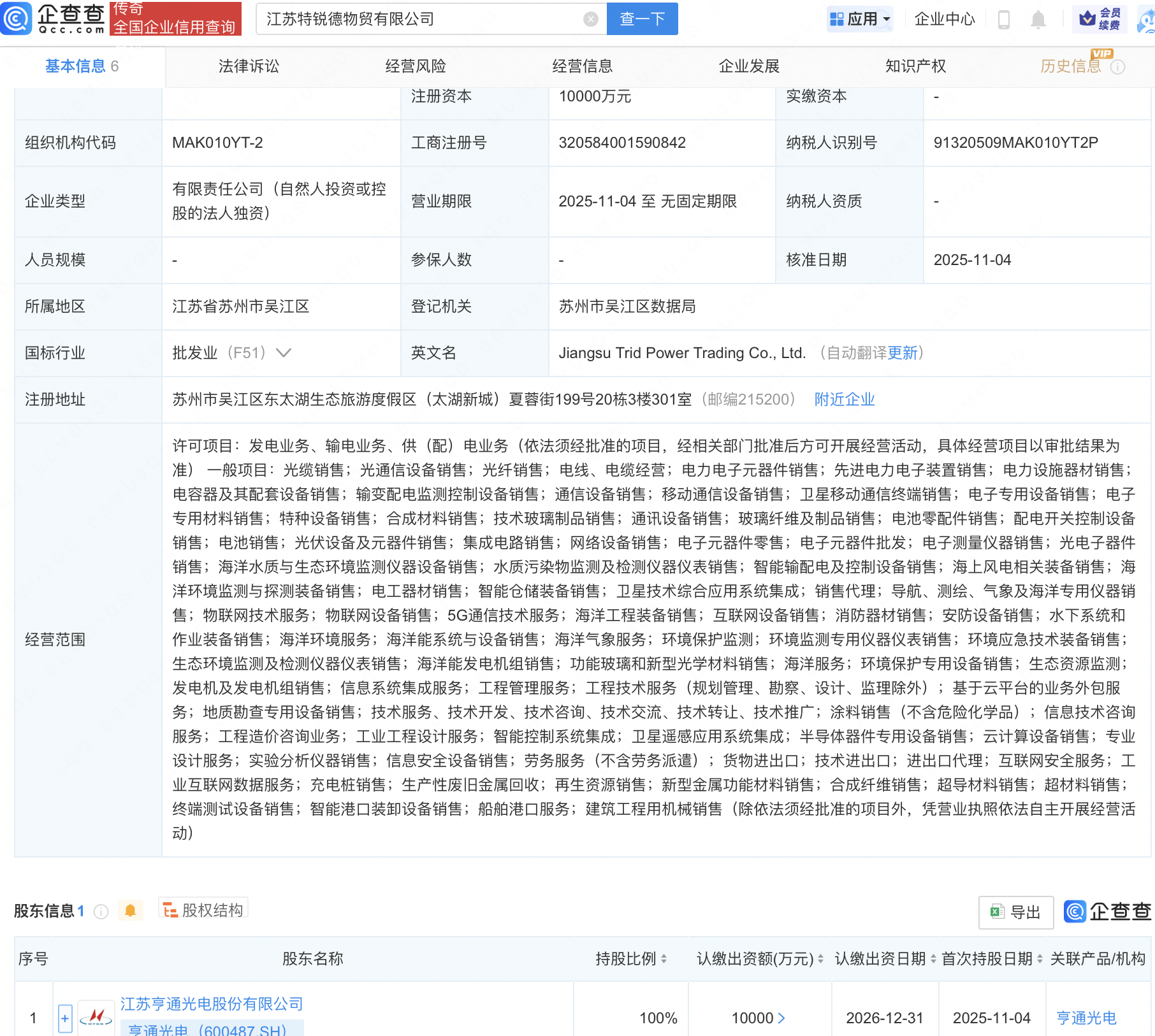 企查查APP显示,近日,江苏特锐德物贸有限公司成立,注册资本1亿元,经营范围包含:集成电路销售;物联网技术服务;物联网设备销售;5G通信技术服务;海洋工程装备销售等。企查查股权穿透显示,该公司由亨通光电(600487)全资持股。