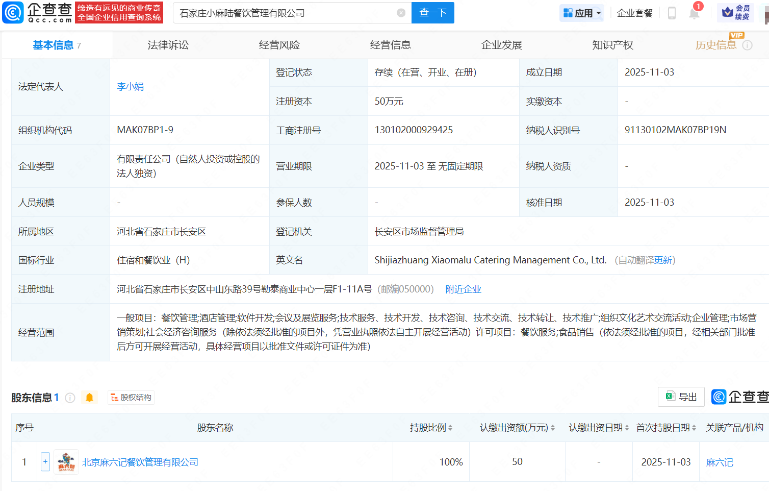 企查查APP显示,近日,石家庄小麻陆餐饮管理有限公司成立,法定代表人为李小娟,注册资本50万,经营范围包含餐饮管理、酒店管理、食品销售等。企查查股权穿透显示,该公司由北京麻六记餐饮管理有限公司全资持股。