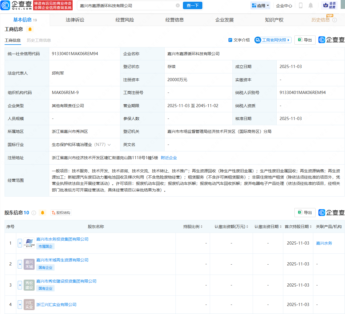 企查查APP显示,近日,嘉兴市嘉源循环科技有限公司成立,法定代表人为邱利军,注册资本为2亿元,经营范围包含:再生资源回收(除生产性废旧金属);生产性废旧金属回收;再生资源销售;再生资源加工等。企查查股权穿透显示,该公司由嘉兴市水务投资集团有限公司、嘉兴市禾城再生资源有限公司等共同持股。