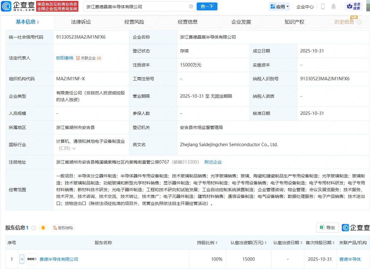 企查查APP显示,近日,浙江赛德晶宸半导体有限公司成立,法定代表人为欧阳春炜,注册资本为1.5亿元,经营范围包含:半导体分立器件制造;半导体器件专用设备制造;技术玻璃制品销售;显示器件制造;电子专用材料制造等。企查查股权穿透显示,该公司由赛德半导体有限公司全资持股。