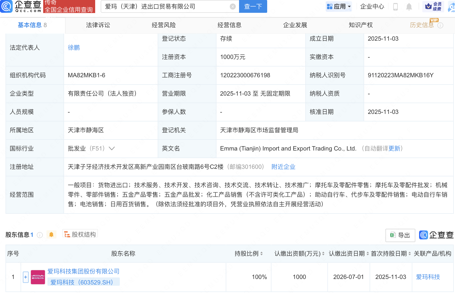 企查查APP显示,近日,爱玛(天津)进出口贸易有限公司成立,注册资本1000万元,经营范围包含:摩托车及零配件零售;摩托车及零配件批发;机械零件、零部件销售;五金产品零售等。企查查股权穿透显示,该公司由爱玛科技(603529)全资持股。