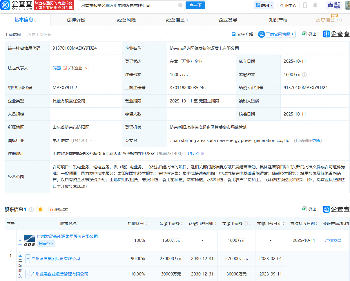 企查查APP显示,近日,济南市起步区穗发新能源发电有限公司成立,法定代表人为高鹏,注册资本为1600万元,经营范围包含:风力发电技术服务;太阳能发电技术服务;充电桩销售;集中式快速充电站;储能技术服务等。企查查股权穿透显示,该公司由广州发展(600098)旗下广州发展新能源集团股份有限公司全资持股。