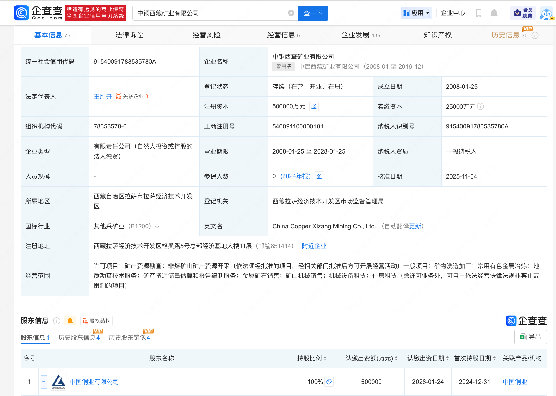 企查查APP显示,近日,中铜西藏矿业有限公司发生工商变更,注册资本由2.5亿人民币增至50亿人民币,增幅1900%。同时,部分主要人员发生变更。企查查信息显示,该公司成立于2008年1月,法定代表人为王胜开,经营范围包括矿产资源勘查、非煤矿山矿产资源开采、矿物洗选加工等,由中国铜业有限公司全资持股。