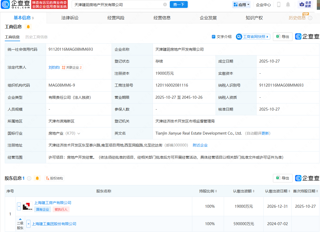 企查查APP显示,近日,天津建玥房地产开发有限公司成立,法定代表人为刘钧钧,注册资本为1.9亿元,经营范围包含:房地产开发经营。企查查股权穿透显示,该公司由上海建工(600170)间接全资持股。