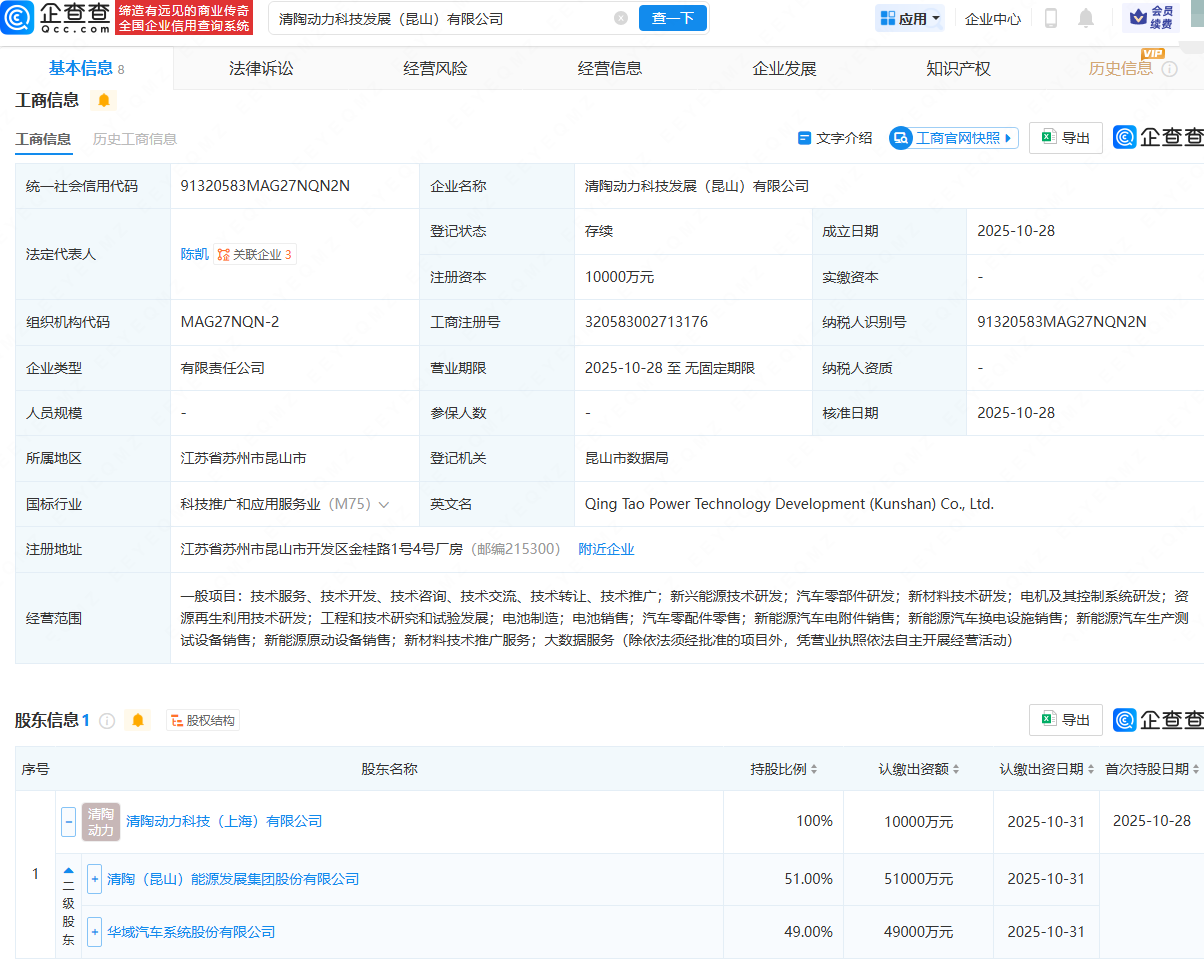 企查查APP显示,近日,清陶动力科技发展(昆山)有限公司成立,法定代表人为陈凯,注册资本为1亿元,经营范围包含:新兴能源技术研发;汽车零部件研发;新材料技术研发;电池制造;电池销售等。企查查股权穿透显示,该公司由清陶动力科技(上海)有限公司全资持股,后者由清陶(昆山)能源发展集团股份有限公司、华域汽车(600741)共同持股。