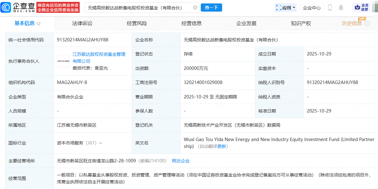 企查查APP显示,近日,无锡高投毅达战新集电股权投资基金(有限合伙)成立,出资额20亿元,经营范围包含:以私募基金从事股权投资、投资管理、资产管理等活动。企查查股权穿透显示,该合伙企业由江苏无锡集成电路产业专项母基金(有限合伙)、江苏高科技投资集团有限公司等共同持股。