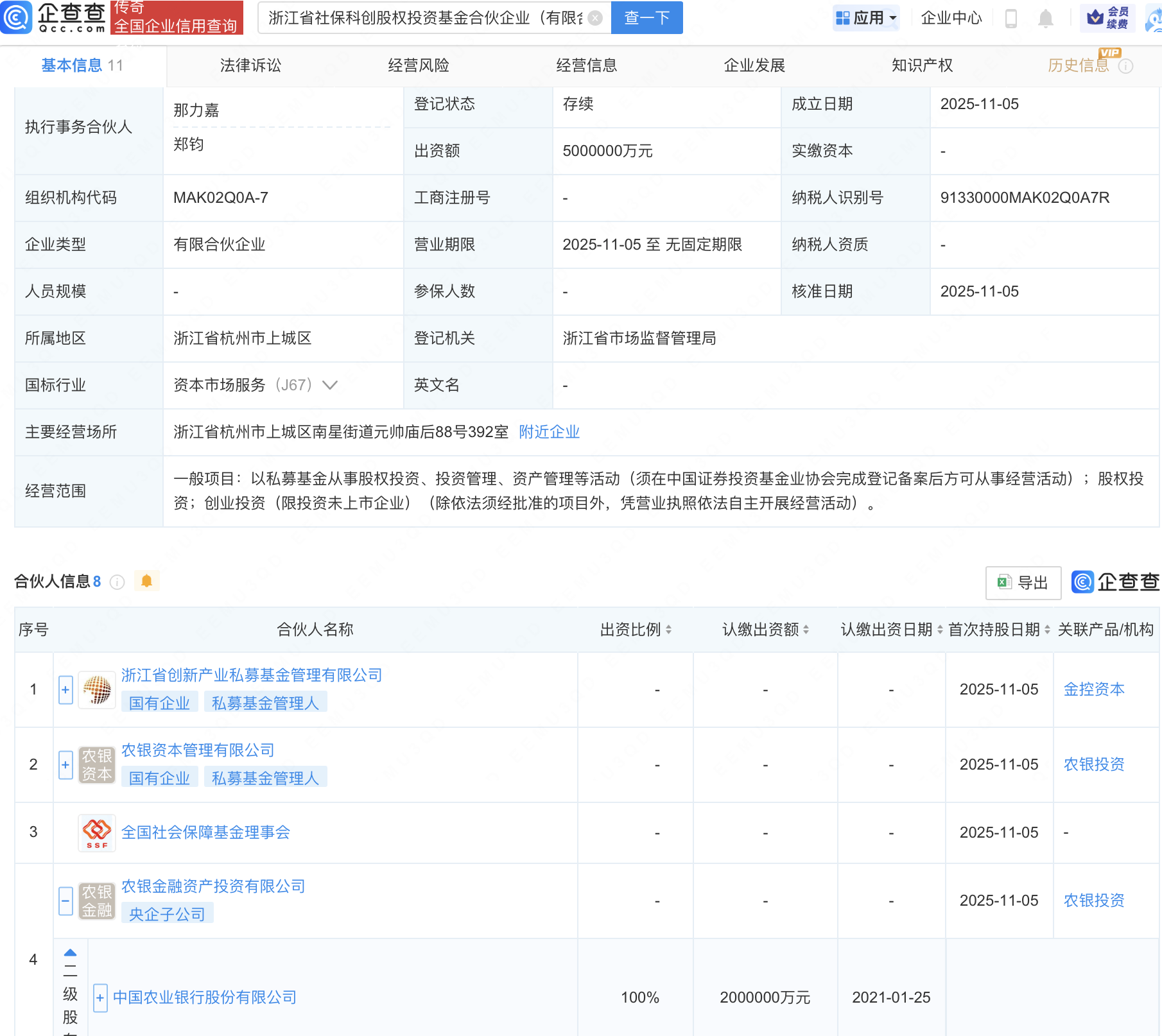 企查查APP显示,近日,浙江省社保科创股权投资基金合伙企业(有限合伙)成立,出资额500亿元,经营范围包含:以私募基金从事股权投资、投资管理、资产管理等活动。企查查股权穿透显示,该企业由浙江省创新产业私募基金管理有限公司、全国社会保障基金理事会、农业银行(601288)旗下农银金融资产投资有限公司等共同出资。
