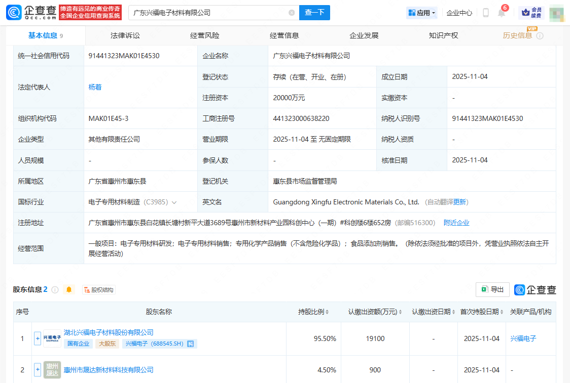 企查查APP显示,近日,广东兴福电子材料有限公司成立,法定代表人为杨着,注册资本2亿元人民币,经营范围涉及电子专用材料研发、电子专用材料销售、专用化学产品销售、食品添加剂销售。企查查股权穿透显示,该公司由兴福电子(688545)、惠州市晟达新材料科技有限公司共同持股。