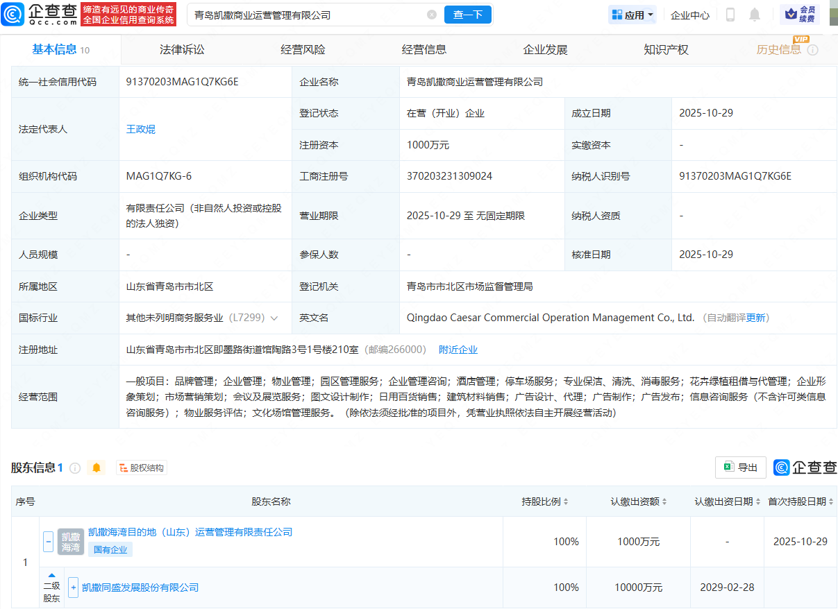企查查APP显示,近日,青岛凯撒商业运营管理有限公司成立,法定代表人为王政焜,注册资本为1000万元,经营范围包含:品牌管理;企业管理;物业管理;园区管理服务;企业管理咨询;酒店管理等。企查查股权穿透显示,该公司由凯撒旅业(000796)间接全资持股。