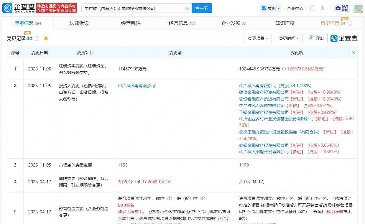企查查APP显示,近日,中广核(内蒙古)新能源投资有限公司发生工商变更,注册资本由约11.47亿增至约132.44亿元人民币,同时新增建设银行(601939)子公司建信金融资产投资有限公司、农业银行(601288)子公司农银金融资产投资有限公司、中广核风力发电有限公司、工商银行(601398)子公司工银金融资产投资有限公司、交通银行(601328)子公司交银金融资产投资有限公司等为股东。