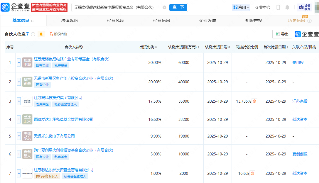 企查查APP显示,近日,无锡高投毅达战新集电股权投资基金(有限合伙)成立,出资额20亿元,经营范围包含:以私募基金从事股权投资、投资管理、资产管理等活动。企查查股权穿透显示,该合伙企业由江苏无锡集成电路产业专项母基金(有限合伙)、江苏高科技投资集团有限公司等共同持股。