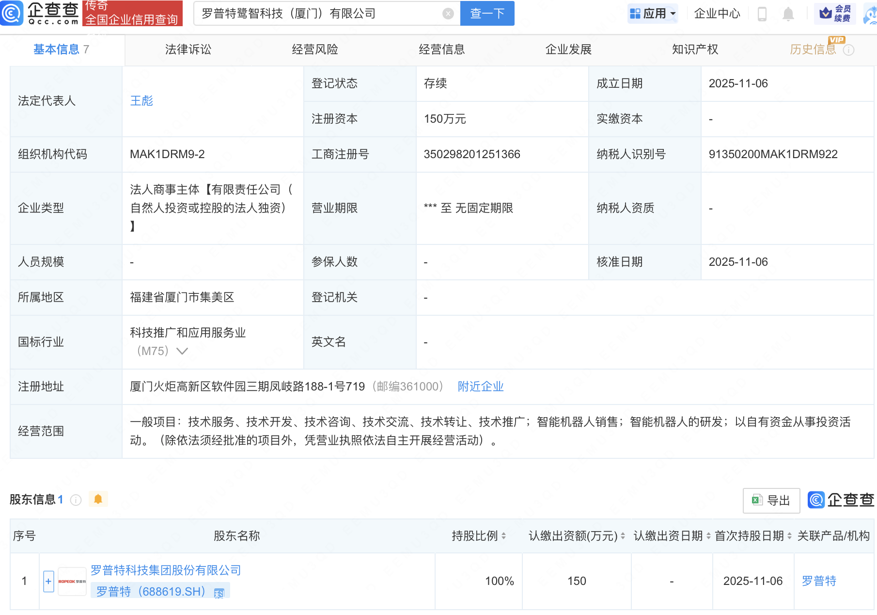 企查查APP显示,近日,罗普特鹭智科技(厦门)有限公司成立,法定代表人为王彪,经营范围包含:智能机器人销售;智能机器人的研发;以自有资金从事投资活动等。企查查股权穿透显示,该公司由罗普特(688619)全资持股。