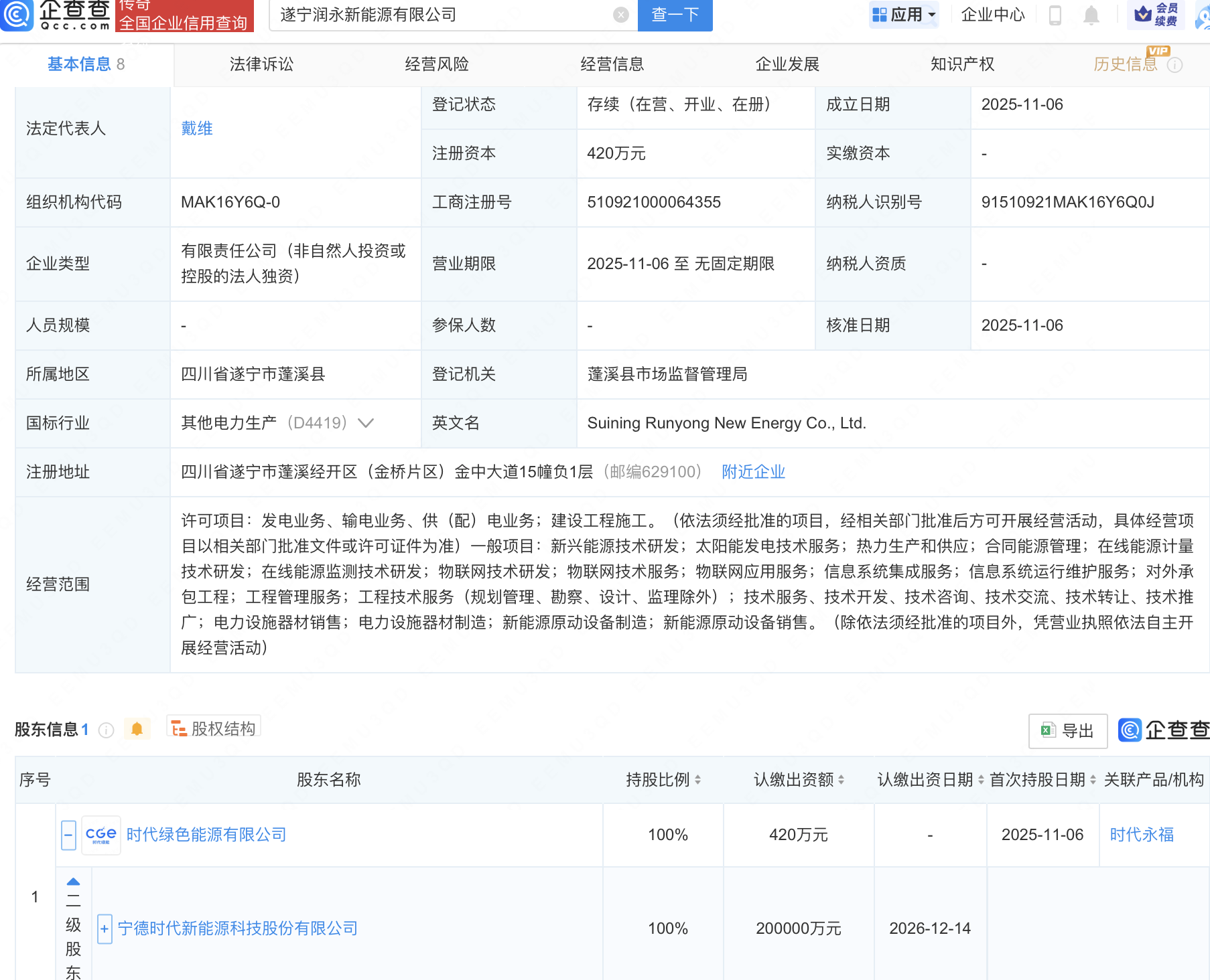 企查查APP显示,近日,遂宁润永新能源有限公司成立,经营范围包含:新兴能源技术研发;太阳能发电技术服务;热力生产和供应;物联网技术服务;物联网应用服务等。企查查股权穿透显示,该公司由宁德时代(300750)间接全资持股。