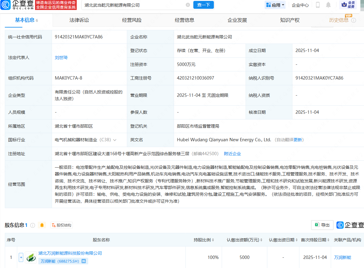 企查查APP显示,近日,湖北武当乾元新能源有限公司成立,法定代表人为刘世琦,注册资本为5000万元,经营范围包含:电池零配件生产;光伏设备及元器件制造;电力设施器材制造;电池零配件销售;充电桩销售等。企查查股权穿透显示,该公司由万润新能(688275)全资持股。