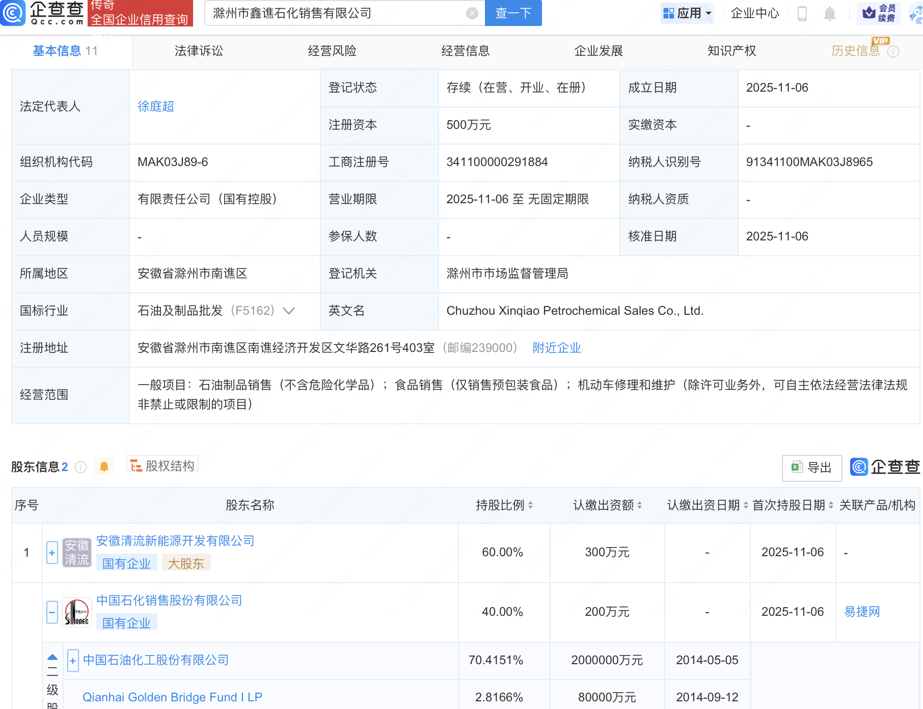 企查查APP显示,近日,滁州市鑫谯石化销售有限公司成立,经营范围包含:石油制品销售(不含危险化学品);食品销售(仅销售预包装食品);机动车修理和维护。企查查股权穿透显示,该公司由中国石化(600028)旗下中国石化销售股份有限公司等共同持股。