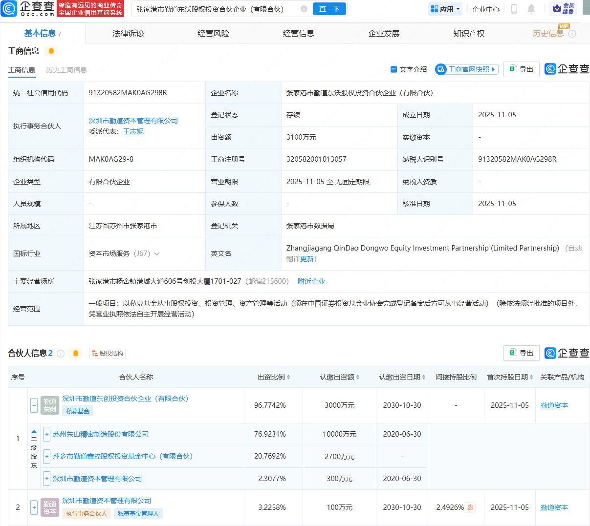 企查查APP显示,近日,张家港市勤道东沃股权投资合伙企业(有限合伙)成立,出资额3100万元,经营范围包含:以私募基金从事股权投资、投资管理、资产管理等活动。企查查股权穿透显示,该合伙企业由东山精密(002384)旗下深圳市勤道东创投资合伙企业(有限合伙)、深圳市勤道资本管理有限公司共同持股。