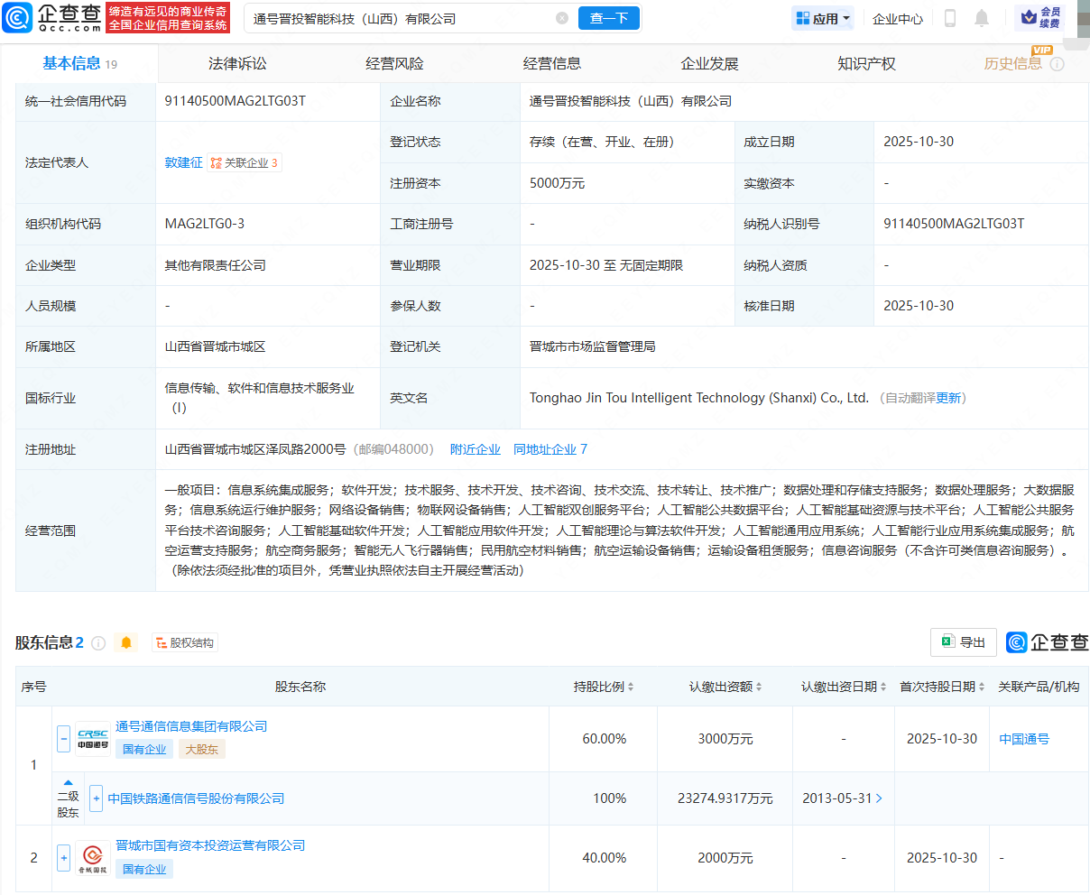 企查查APP显示,近日,通号晋投智能科技(山西)有限公司成立,法定代表人为敦建征,注册资本为5000万元,经营范围包含:数据处理服务;人工智能双创服务平台;人工智能公共数据平台;航空运营支持服务等。企查查股权穿透显示,该公司由中国通号(688009)全资子公司通号通信信息集团有限公司、晋城市国有资本投资运营有限公司共同持股。
