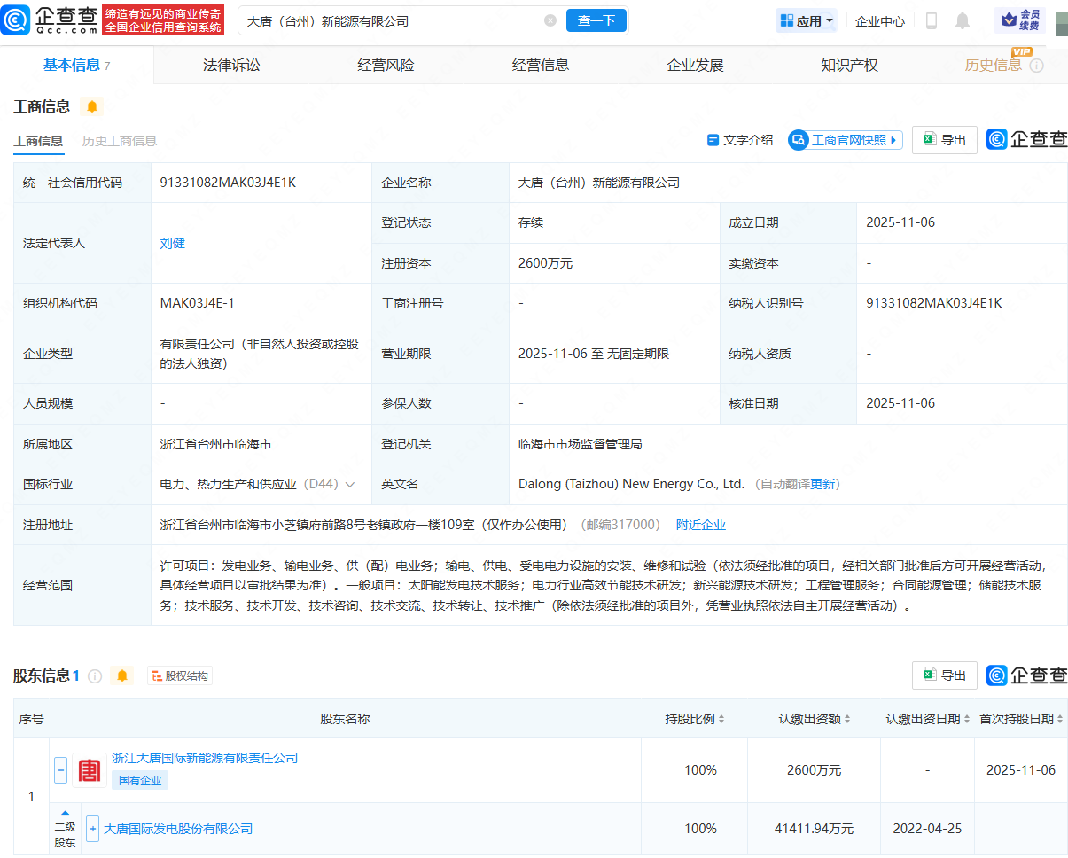 企查查APP显示,近日,大唐(台州)新能源有限公司成立,法定代表人为刘健,注册资本为2600万元,经营范围包含:发电业务、输电业务、供(配)电业务;电力行业高效节能技术研发;新兴能源技术研发;储能技术服务等。企查查股权穿透显示,该公司由大唐发电(601991)间接全资持股。