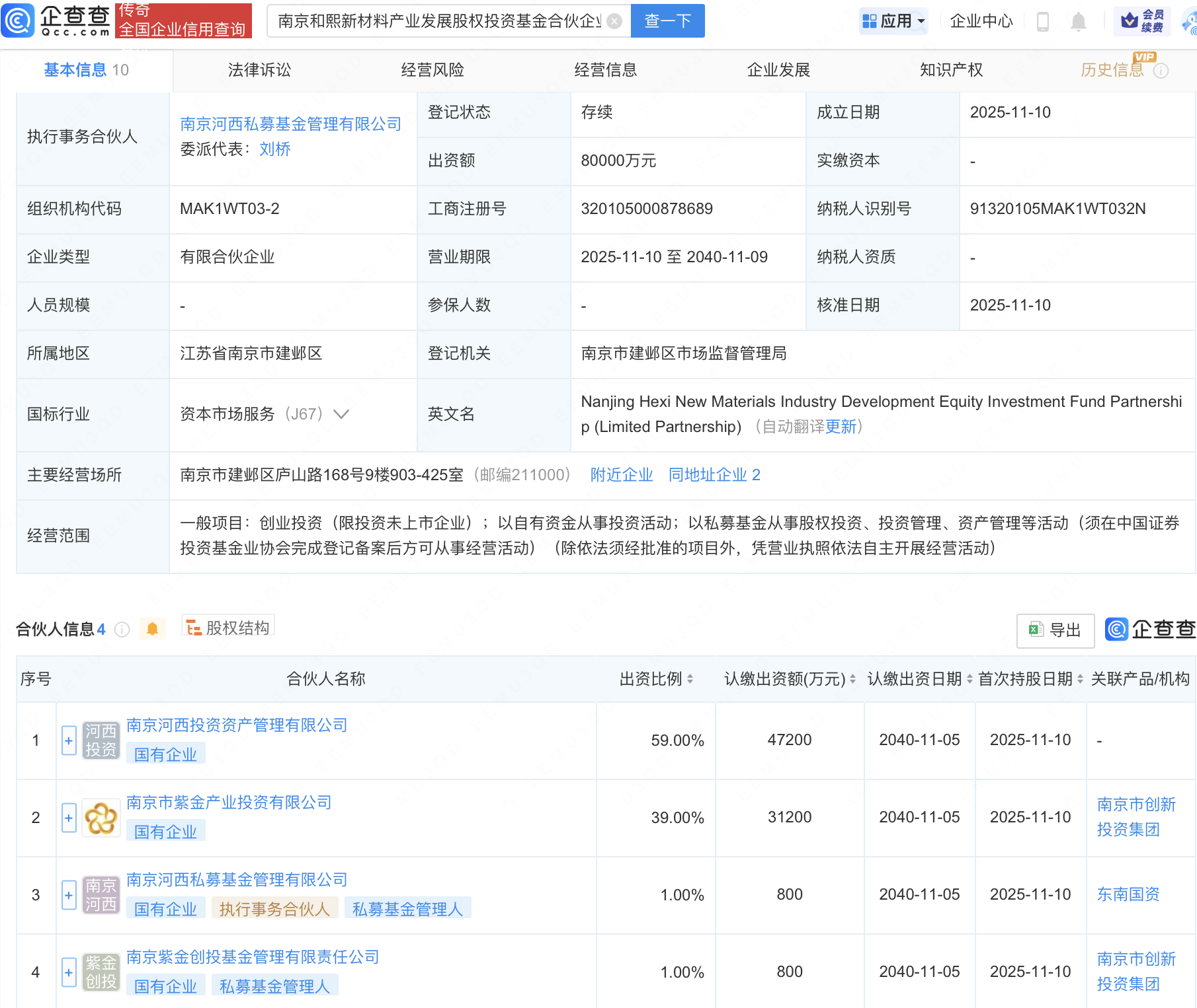 企查查APP显示,近日,南京和熙新材料产业发展股权投资基金合伙企业(有限合伙)成立,出资额8亿元,经营范围包含:创业投资(限投资未上市企业);以自有资金从事投资活动;以私募基金从事股权投资、投资管理、资产管理等活动。企查查股权穿透显示,该企业由南京市紫金产业投资有限公司等共同出资。