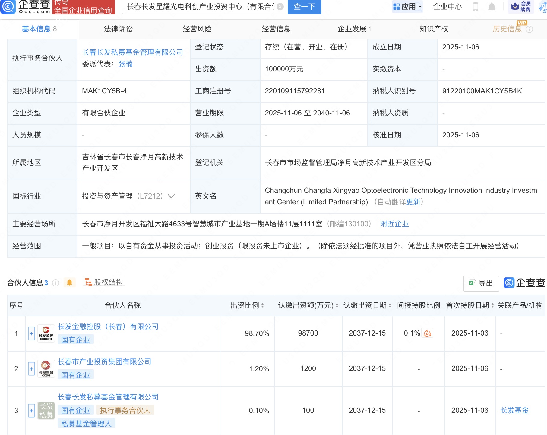 企查查APP显示,近日,长春长发星耀光电科创产业投资中心(有限合伙)成立,出资额10亿人民币,经营范围为以自有资金从事投资活动、创业投资。企查查股权穿透显示,该企业由长发金融控股(长春)有限公司、长春市产业投资集团有限公司、长春长发私募基金管理有限公司共同出资。