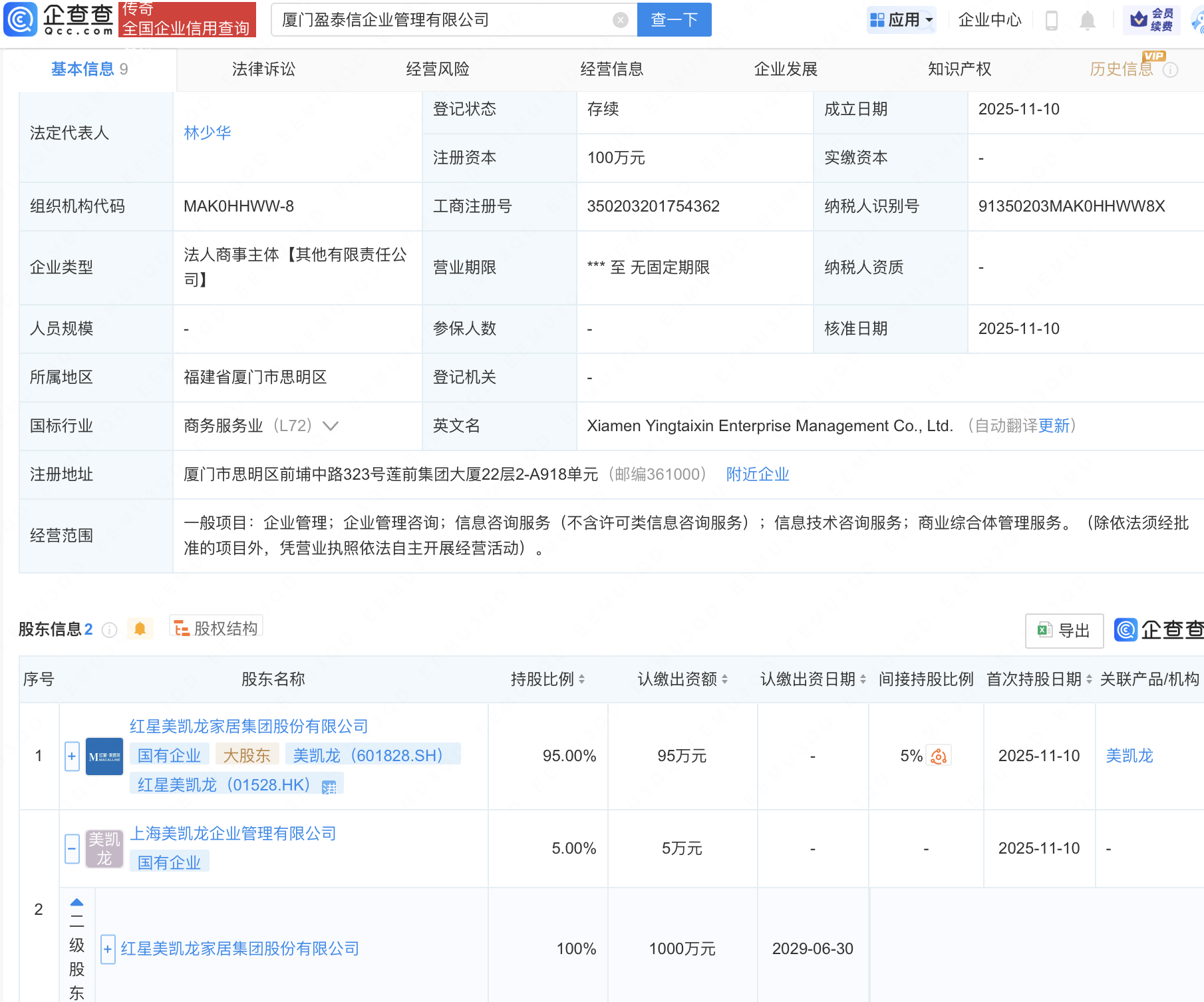 企查查APP显示,近日,厦门盈泰信企业管理有限公司成立,法定代表人为林少华,经营范围包含:企业管理;企业管理咨询;信息咨询服务(不含许可类信息咨询服务);信息技术咨询服务;商业综合体管理服务。企查查股权穿透显示,该公司由美凯龙(601828)间接全资持股。