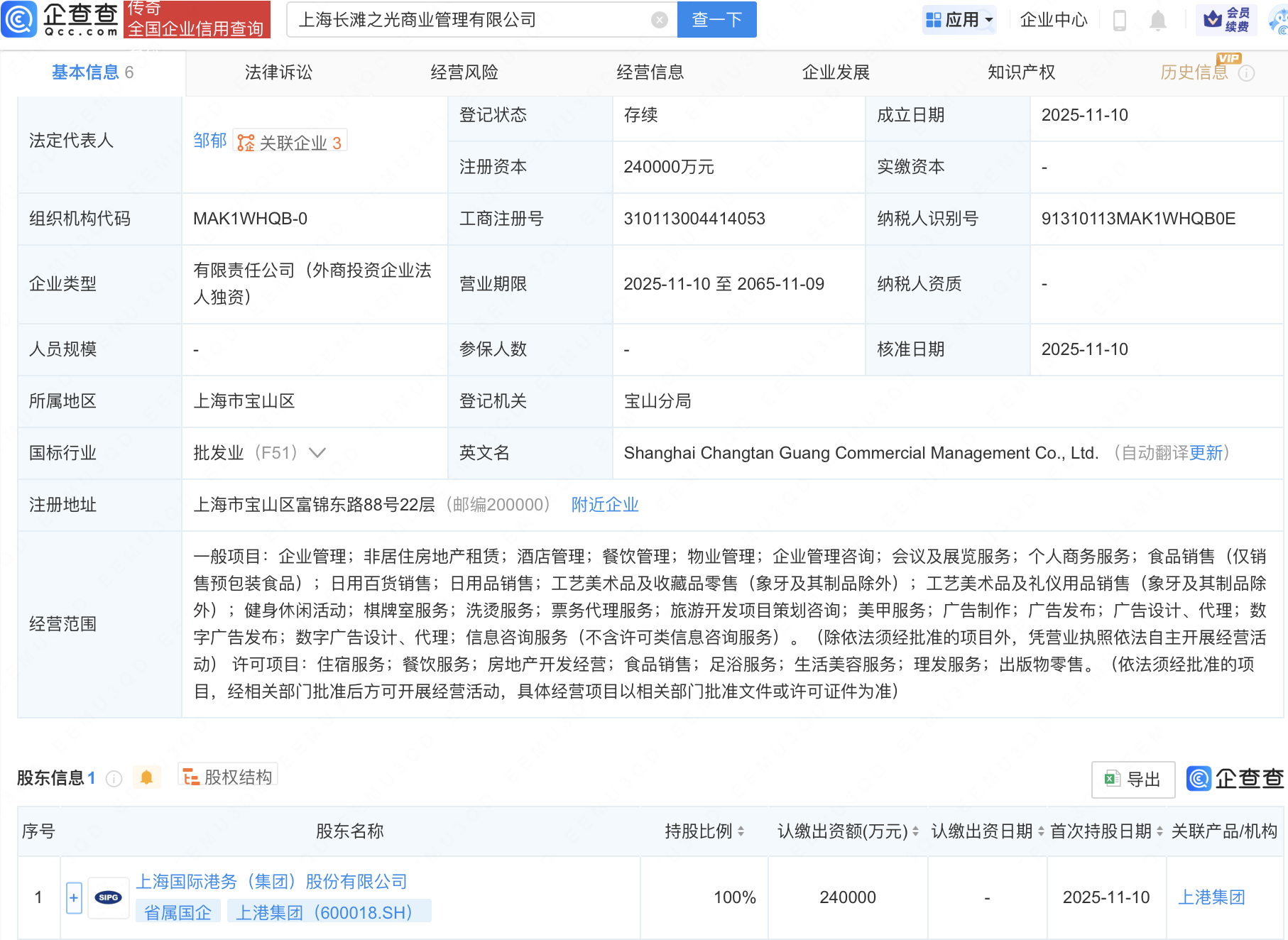 企查查APP显示,近日,上海长滩之光商业管理有限公司成立,注册资本24亿元,经营范围包含:企业管理;非居住房地产租赁;酒店管理;餐饮管理;物业管理等。企查查股权穿透显示,该公司由上港集团(600018)全资持股。