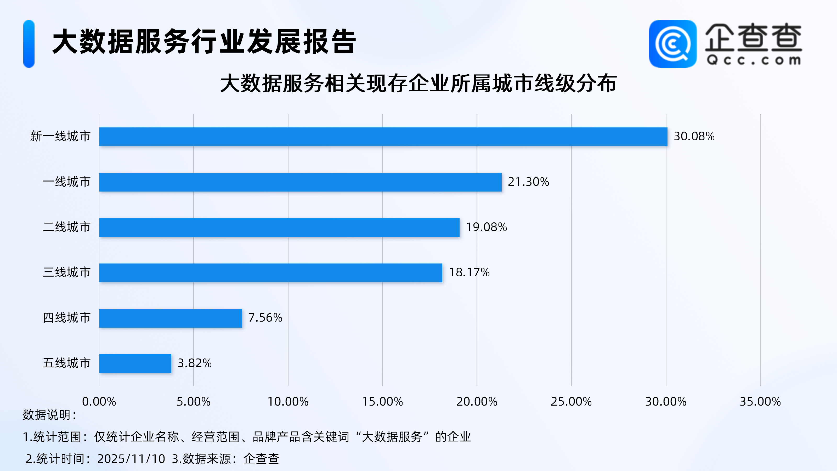 企查查数据显示,截至11月10日,国内大数据服务相关企业现存量达75.19万家,主要集中在新一线城市、一线城市,分别占比30.08%、21.3%。分布在二线、三线城市的相关企业,占比均在18%-20%之间。