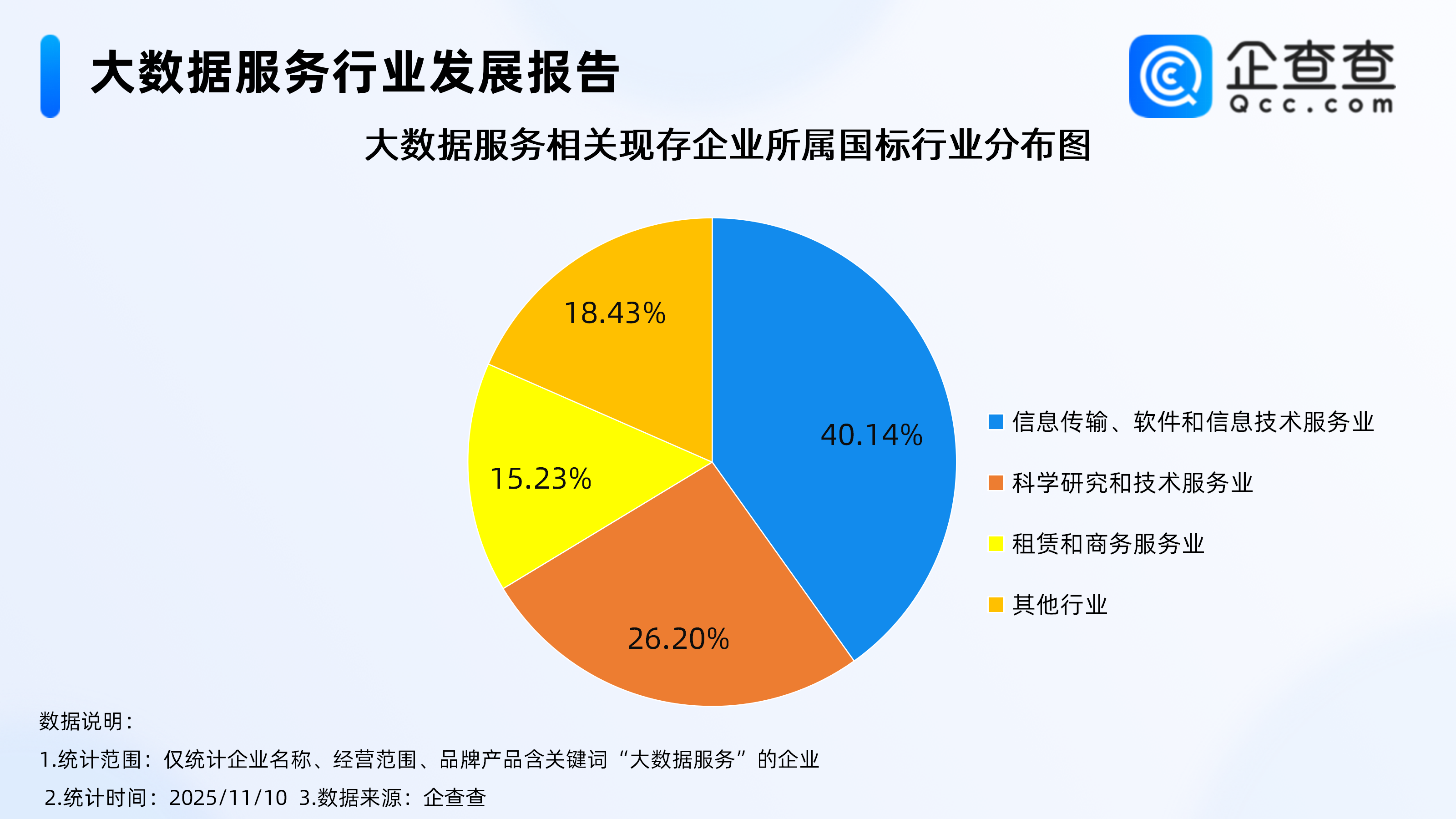企查查数据显示,从国标行业分布来看,国内大数据服务相关现存企业中,超4成相关企业归属于信息传输、软件和信息技术服务业,占比达40.14%,其次为归属于科学研究和技术服务业的相关企业,占比达26.2%。