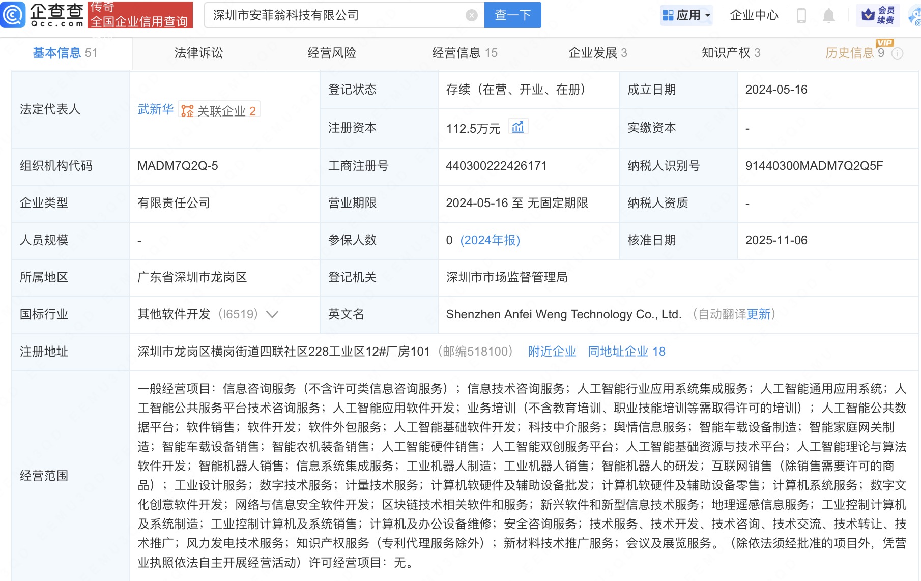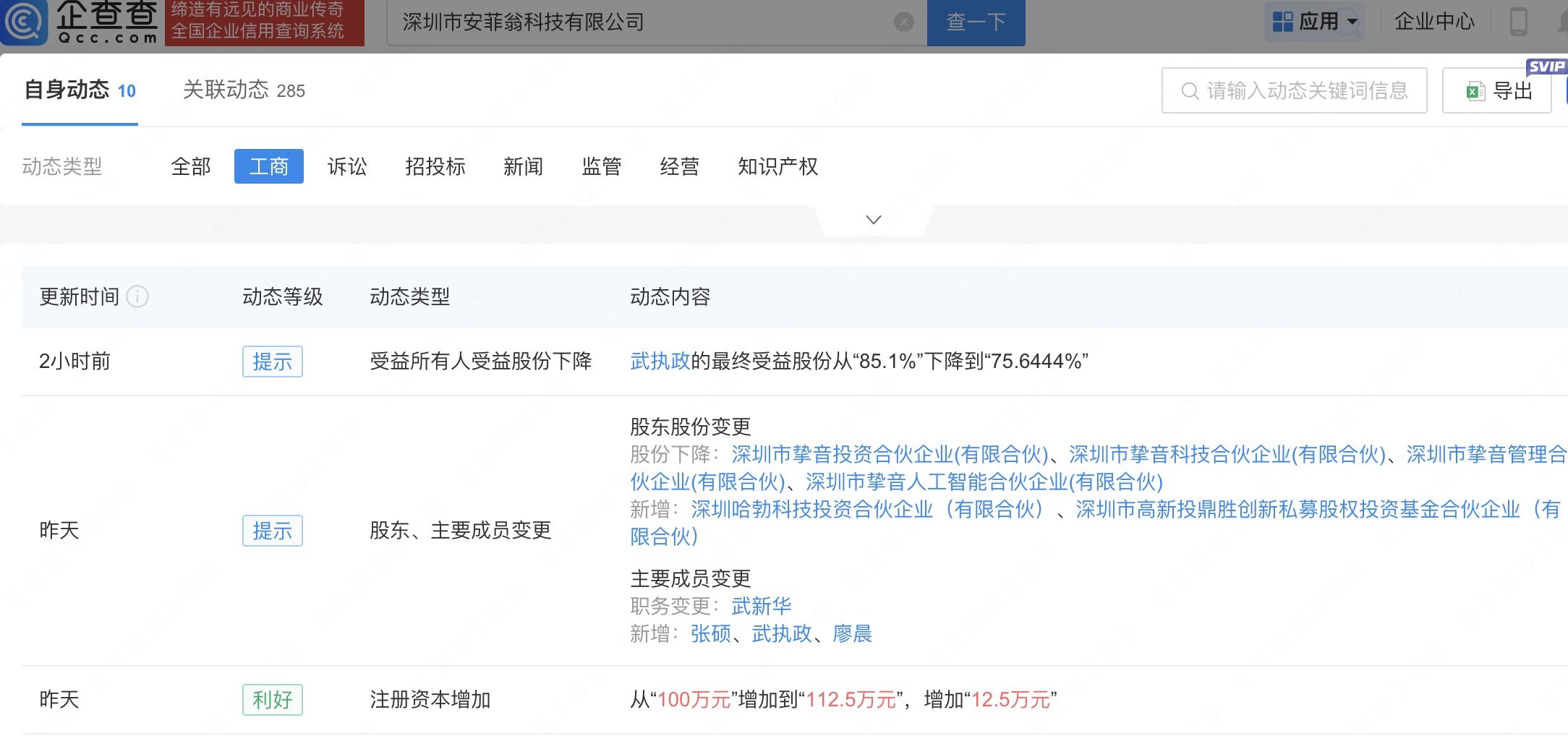 企查查APP显示,近日,深圳市安菲翁科技有限公司发生工商变更,新增华为旗下深圳哈勃科技投资合伙企业(有限合伙)等为股东,同时注册资本增至112.5万人民币。企查查信息显示,该公司成立于2024年,法定代表人为武新华,经营范围包括人工智能行业应用系统集成服务、人工智能通用应用系统等。公开信息显示,该公司是一家专注于语音AI大模型领域的公司。