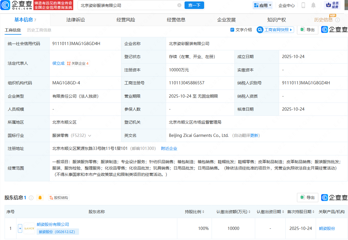 企查查APP显示,近日,北京姿彩服装有限公司成立,法定代表人为侯立成,注册资本为1亿元,经营范围包含:服装服饰零售;服装制造;专业设计服务;针纺织品销售;箱包制造;箱包销售;鞋帽批发等。企查查股权穿透显示,该公司由朗姿股份(002612)全资持股。