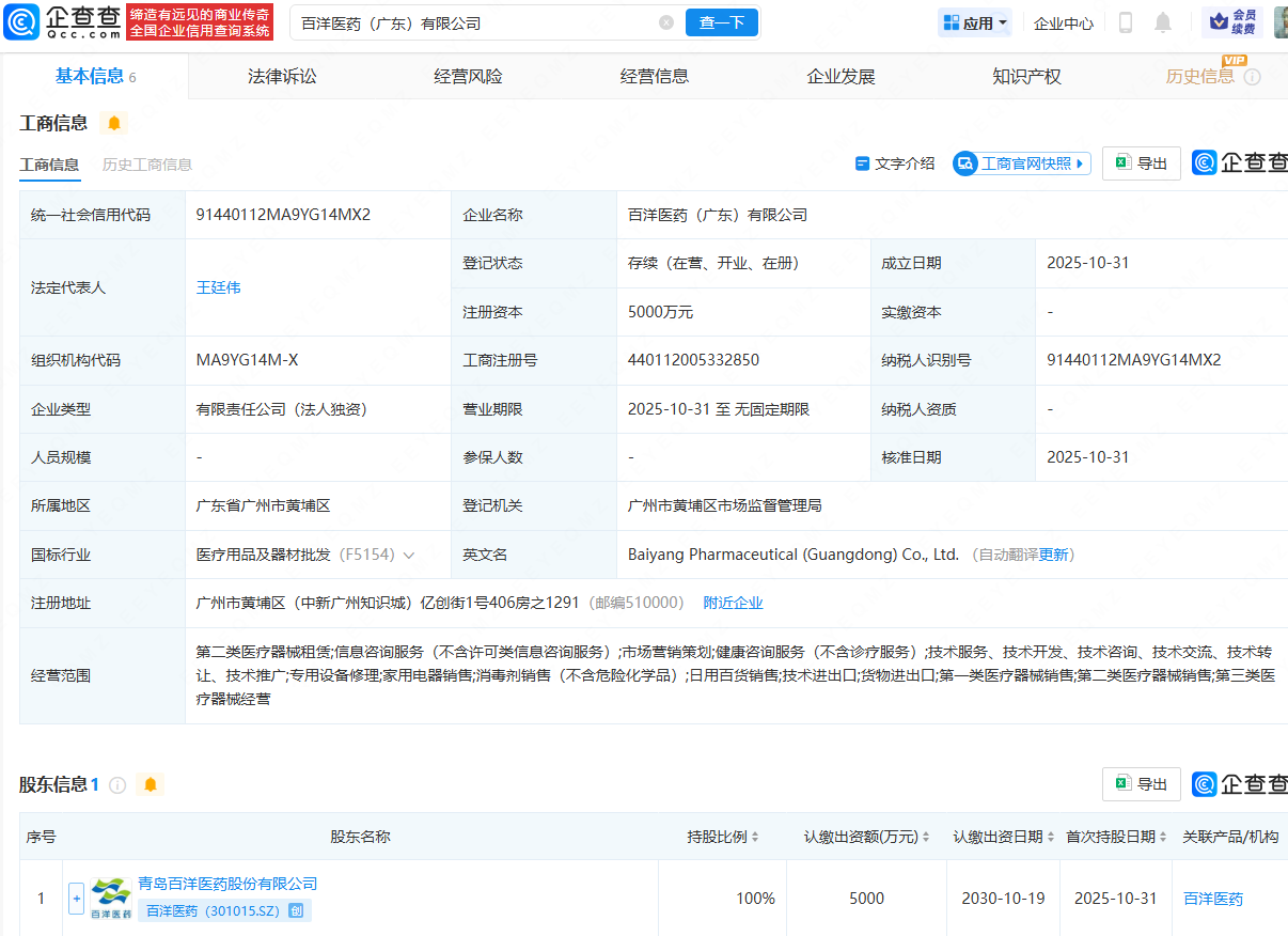 企查查APP显示,近日,百洋医药(广东)有限公司成立,法定代表人为王廷伟,注册资本为5000万元,经营范围包含:第二类医疗器械租赁;市场营销策划;专用设备修理;家用电器销售;第三类医疗器械经营等。企查查股权穿透显示,该公司由百洋医药(301015)全资持股。