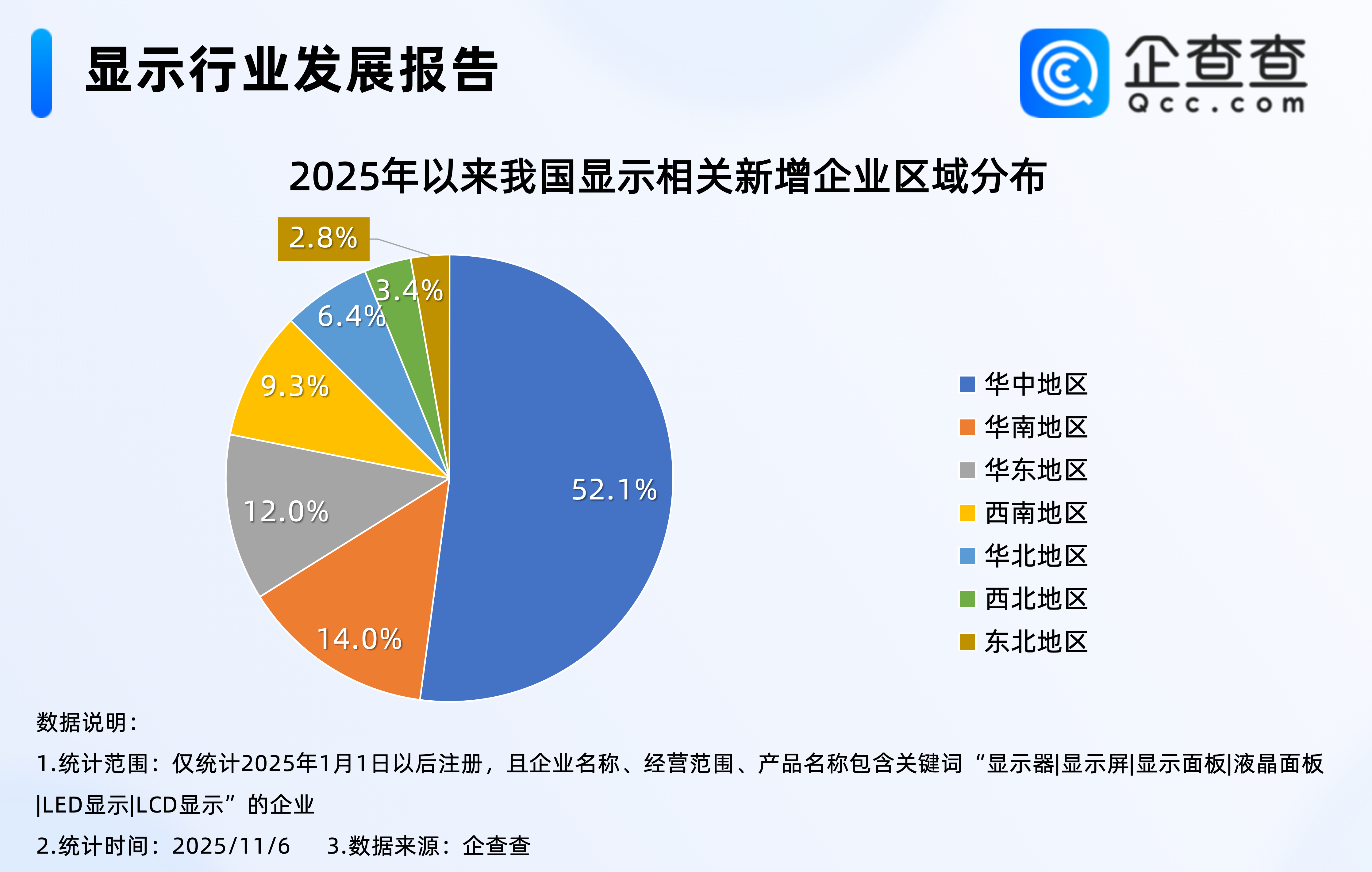 企查查数据显示,2025年以来新注册的16.11万家显示相关企业主要分布在华中、华南、华东地区,其中华中地区占比52.1%,注册量领跑全国,东北地区新增显示相关企业相对较少,占比2.8%。
