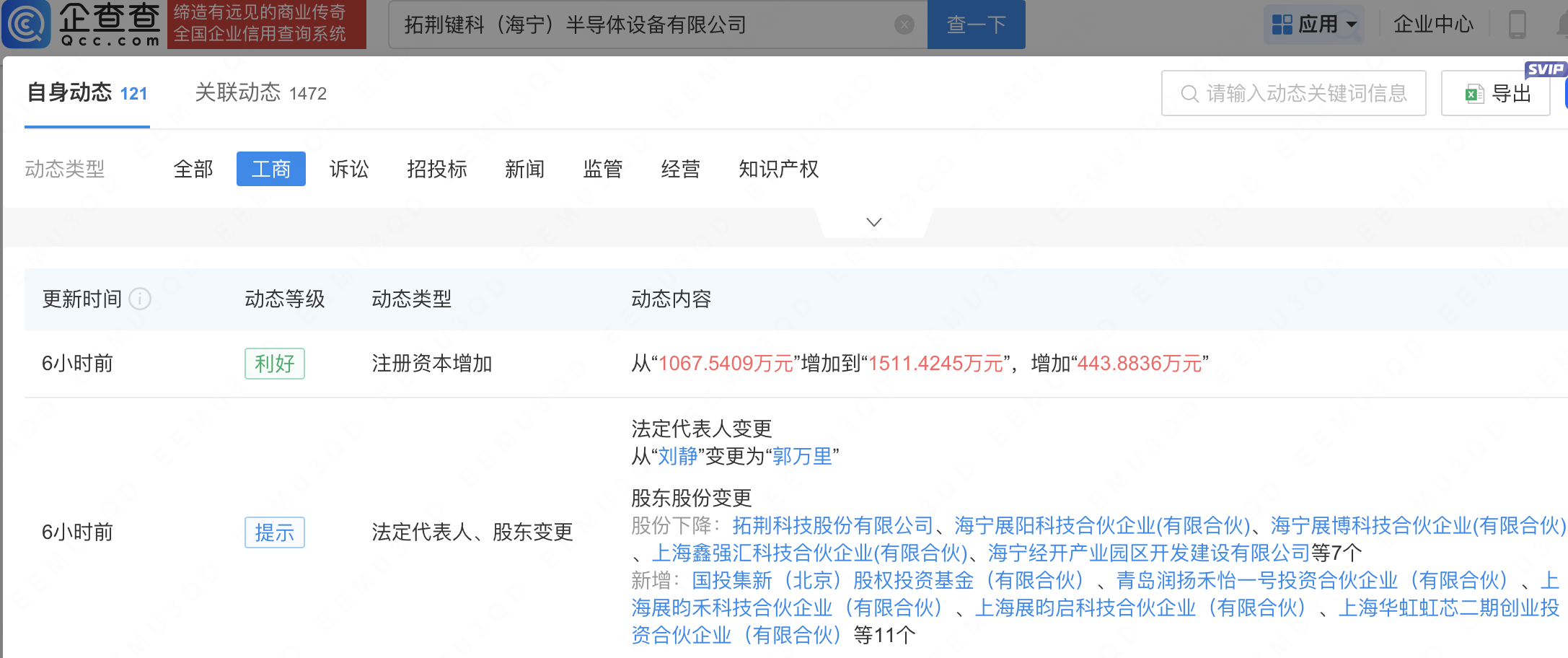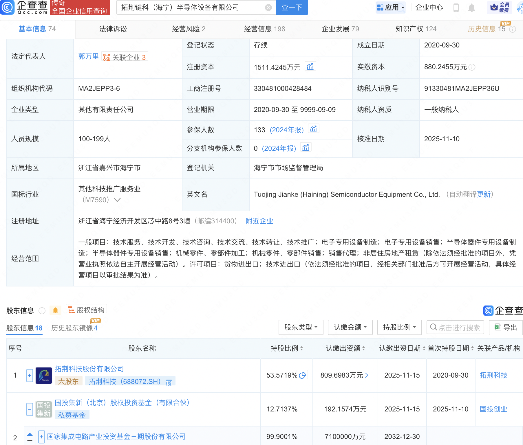 企查查APP显示,近日,拓荆键科(海宁)半导体设备有限公司发生工商变更,新增国家集成电路产业投资基金三期股份有限公司旗下国投集新(北京)股权投资基金(有限合伙)等为股东,同时注册资本增至1511.42万元。企查查信息显示,该公司成立于2020年,经营范围包含:电子专用设备制造;电子专用设备销售;半导体器件专用设备制造等,其大股东为拓荆科技(688072),持股53.57%。