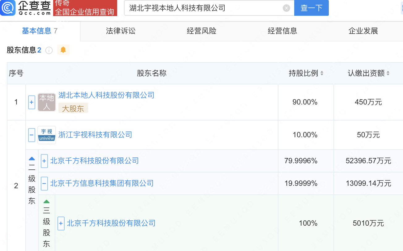 企查查APP显示,近日,湖北宇视本地人科技有限公司成立,法定代表人为张银才,经营范围包含:集成电路芯片及产品制造;智能机器人销售;智能机器人的研发;人工智能硬件销售;人工智能行业应用系统集成服务;智能无人飞行器制造等。企查查股权穿透显示,该公司由千方科技(002373)旗下浙江宇视科技有限公司等共同持股。