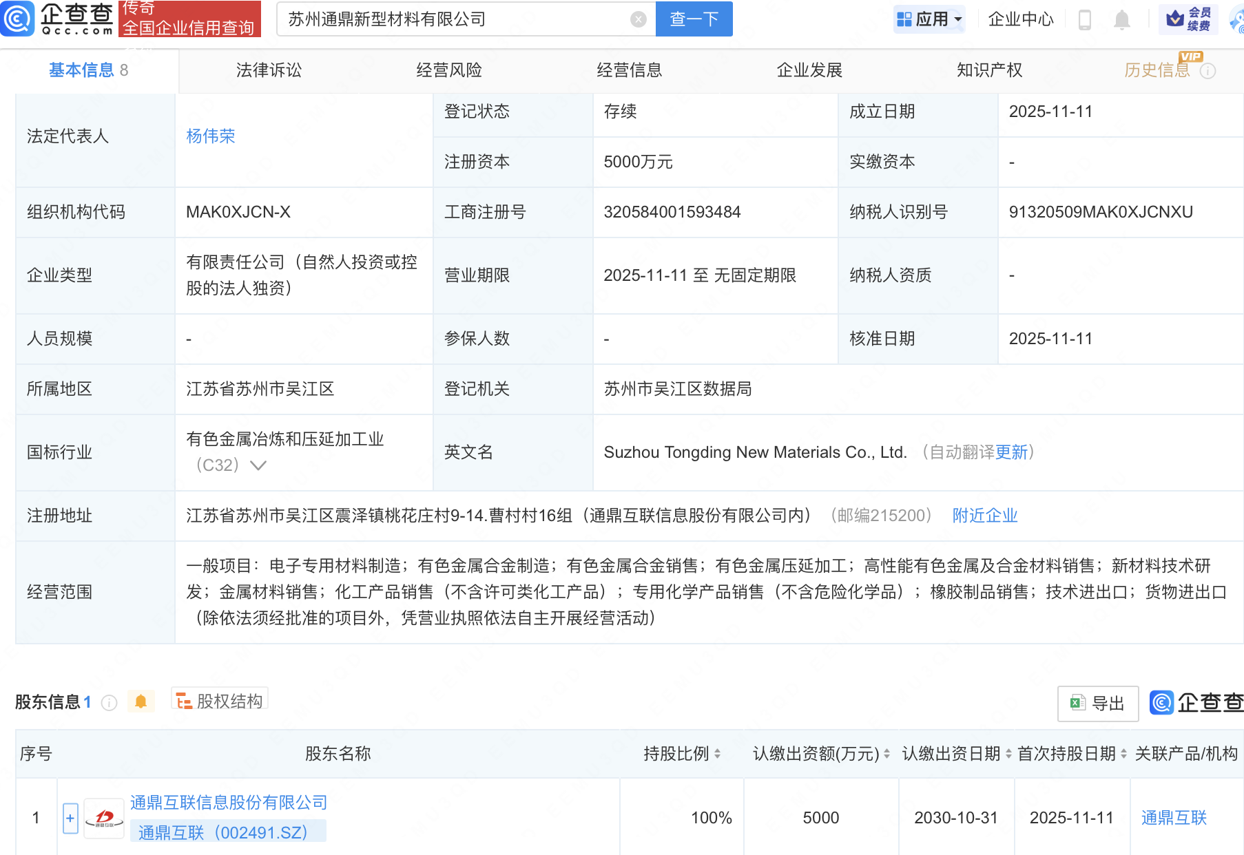 企查查APP显示,近日,苏州通鼎新型材料有限公司成立,注册资本5000万元,经营范围包含:电子专用材料制造;有色金属合金制造;有色金属合金销售;有色金属压延加工等。企查查股权穿透显示,该公司由通鼎互联(002491)全资持股。