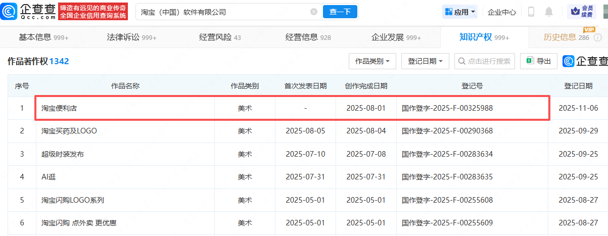 企查查APP显示,近日,淘宝(中国)软件有限公司登记“淘宝便利店”作品著作权,作品类别为美术。据媒体报道,10月31日,淘宝闪购正式发布连锁便利品牌“淘宝便利店”,该品牌于11月1日正式面向消费者上线。