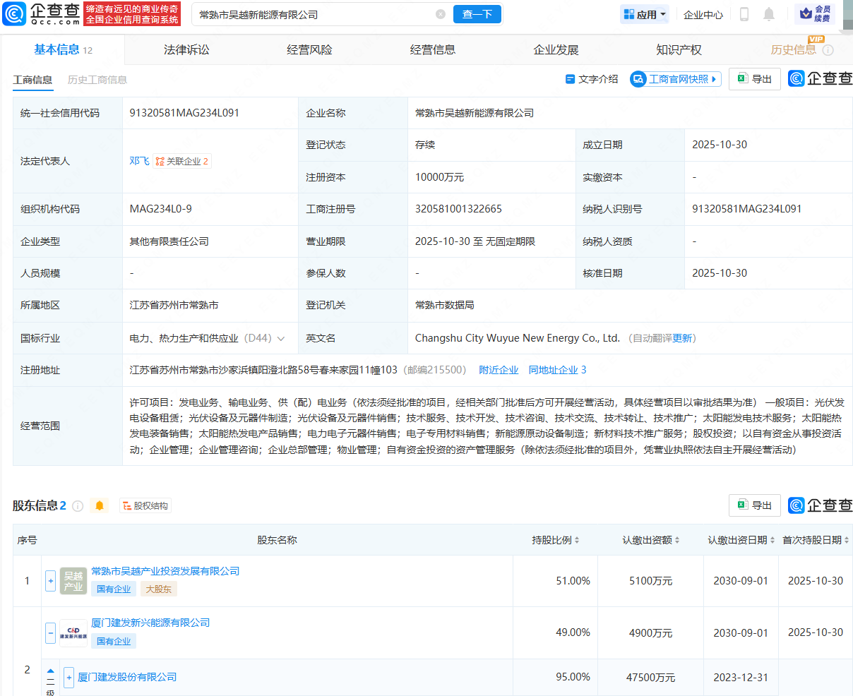 企查查APP显示,近日,常熟市吴越新能源有限公司成立,法定代表人为邓飞,注册资本为1亿元,经营范围包含:光伏发电设备租赁;光伏设备及元器件制造;太阳能热发电装备销售;电力电子元器件销售等。企查查股权穿透显示,该公司由常熟市吴越产业投资发展有限公司、建发股份(600153)旗下厦门建发新兴能源有限公司共同持股。