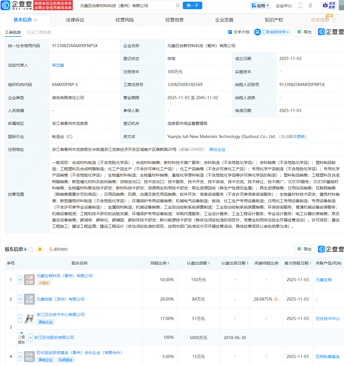 企查查APP显示,近日,元嘉巨合新材料科技(衢州)有限公司成立,法定代表人为麻忠勤,经营范围包含:合成材料销售;新材料技术推广服务;生物基材料制造;3D打印服务;生物基材料聚合技术研发等。企查查股权穿透显示,该公司由元嘉生物科技(衢州)有限公司、巨化股份(600160)全资子公司浙江巨化技术中心有限公司等共同持股。