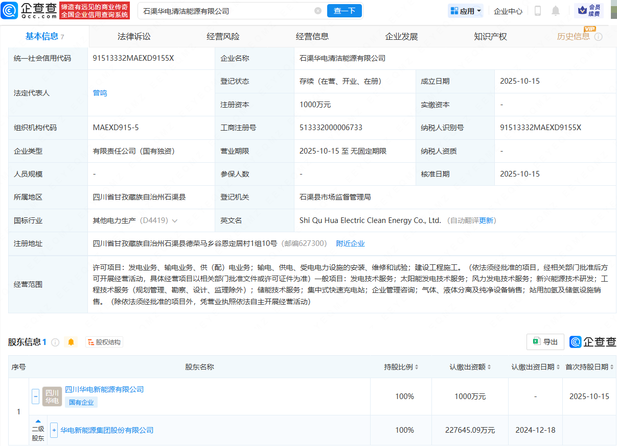 企查查APP显示,近日,石渠华电清洁能源有限公司成立,法定代表人为曾鸣,注册资本为1000万元,经营范围包含:发电业务、输电业务、供(配)电业务;太阳能发电技术服务;储能技术服务;集中式快速充电站等。企查查股权穿透显示,该公司由华电新能(600930)间接全资持股。