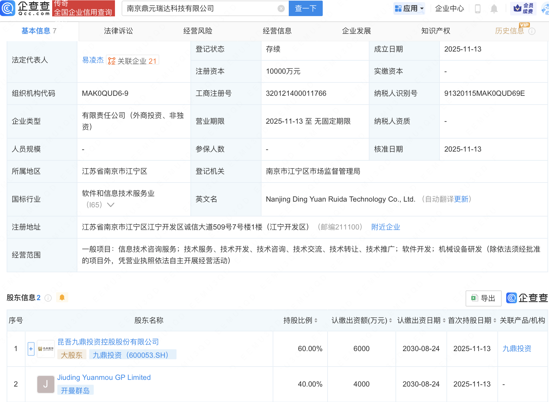 企查查APP显示,近日,南京鼎元瑞达科技有限公司成立,注册资本1亿元,经营范围包含:信息技术咨询服务;软件开发;机械设备研发等。企查查股权穿透显示,该公司由九鼎投资(600053)等共同持股。