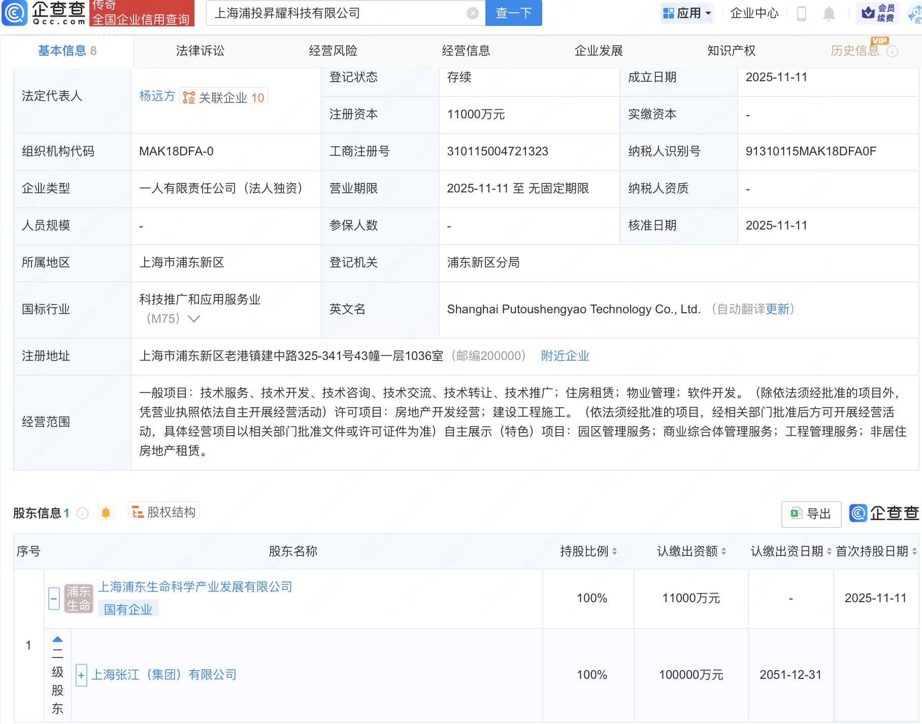 企查查APP显示,近日,上海浦投昇耀科技有限公司成立,法定代表人为杨远方,注册资本1.1亿人民币,经营范围含住房租赁、物业管理、软件开发、房地产开发经营、建设工程施工等。企查查股权穿透显示,该公司由上海张江(集团)有限公司间接全资持股。