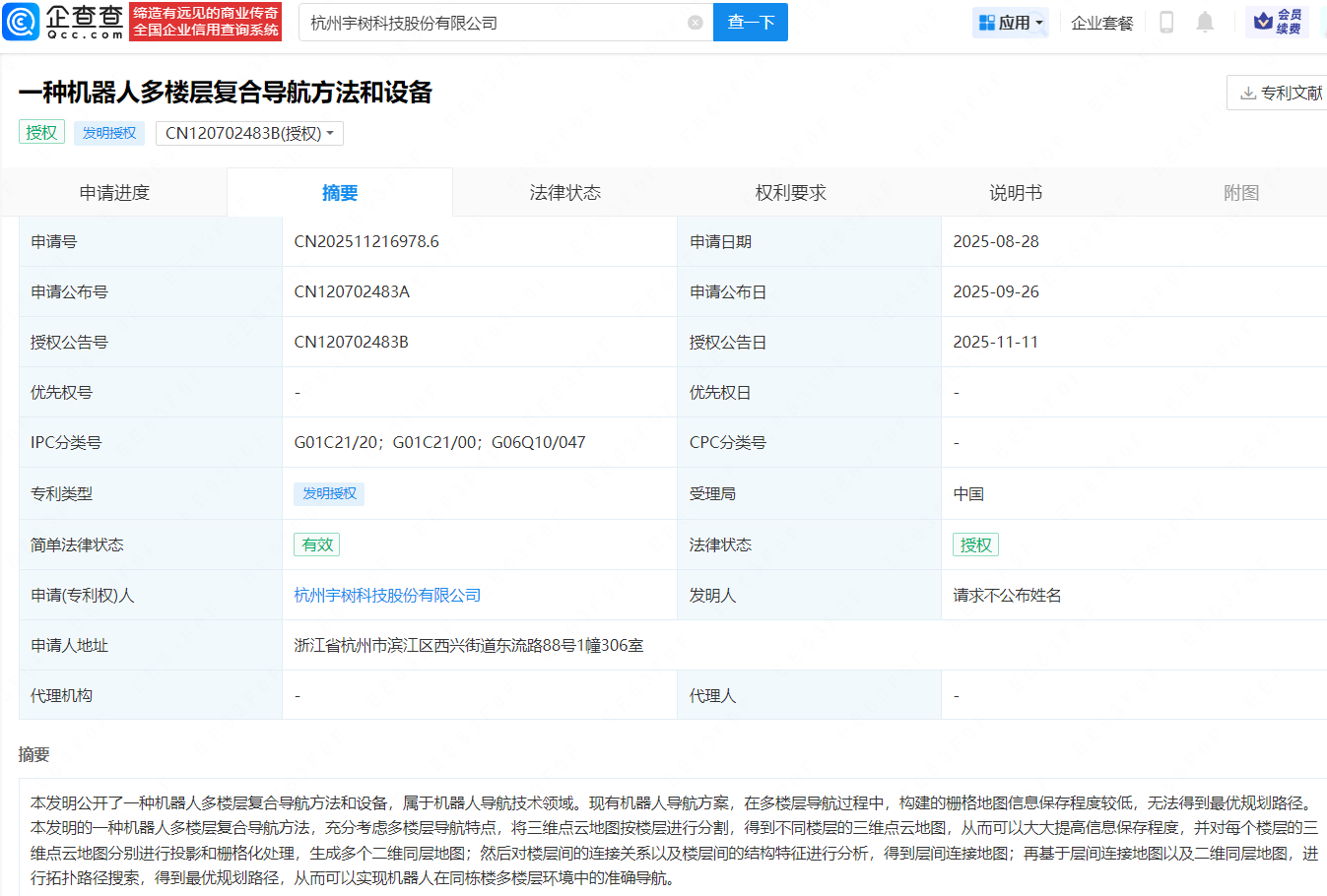 企查查APP显示,近日,宇树科技股份有限公司申请的“一种机器人多楼层复合导航方法和设备”专利获授权。